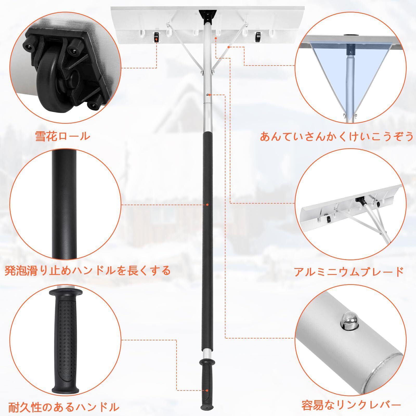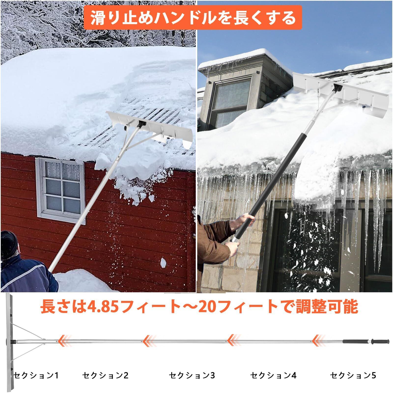 【2025最新】AKOZLIN 雪下ろし棒 屋根 雪かきスコップ 雪かき棒 雪庇落とし 除雪道具 軽量 5本のアルミロッド 1.5m-6.1m長さ調整可能 雪降ろし棒 凍雪除去 雪下ろし道具 ホイール付き