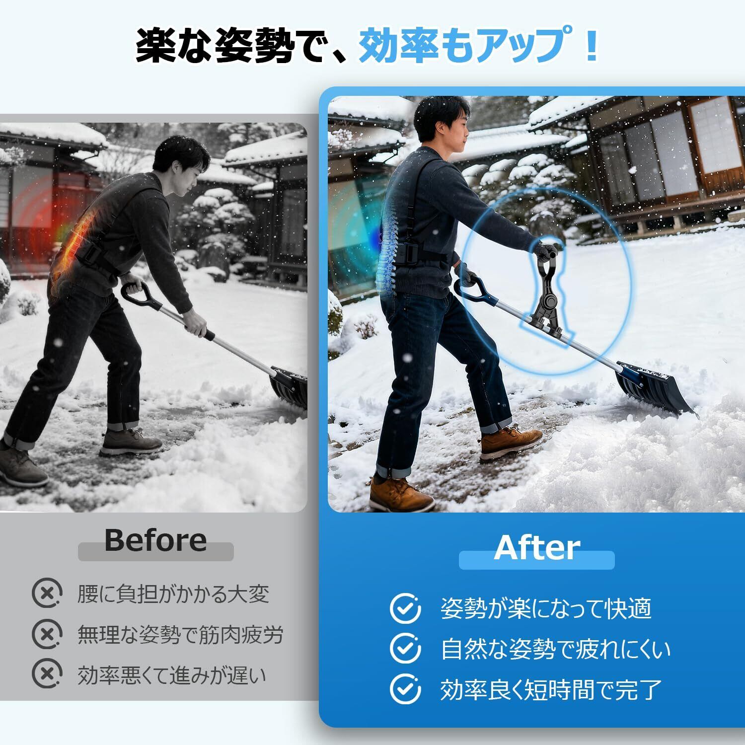 【負担軽減設計】雪かきスコップ助力ハンドルを取り付けることで、従来のように深くかがむ必要がなく、自然な姿勢で作業が可能になります。手首や腰への負担を大幅に軽減し、雪かき・除雪・土掘り・草刈り・落ち葉掃除など、さまざまな屋外作業を快適にサポートできます。