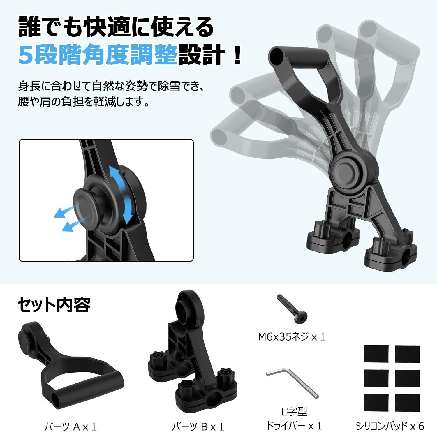 【セット内容】パーツ Ax1、パーツBx1、M6x35ネジx1、L字型ドライバーx1、シリコンパッドx6(※シリコンパッド装着時:ハンドル直径 約23mm に対応)※ご注意:本製品は補助ハンドル単品であり、スコップ本体(雪かきシャベル)は含まれておりません。※本製品は意匠登録中