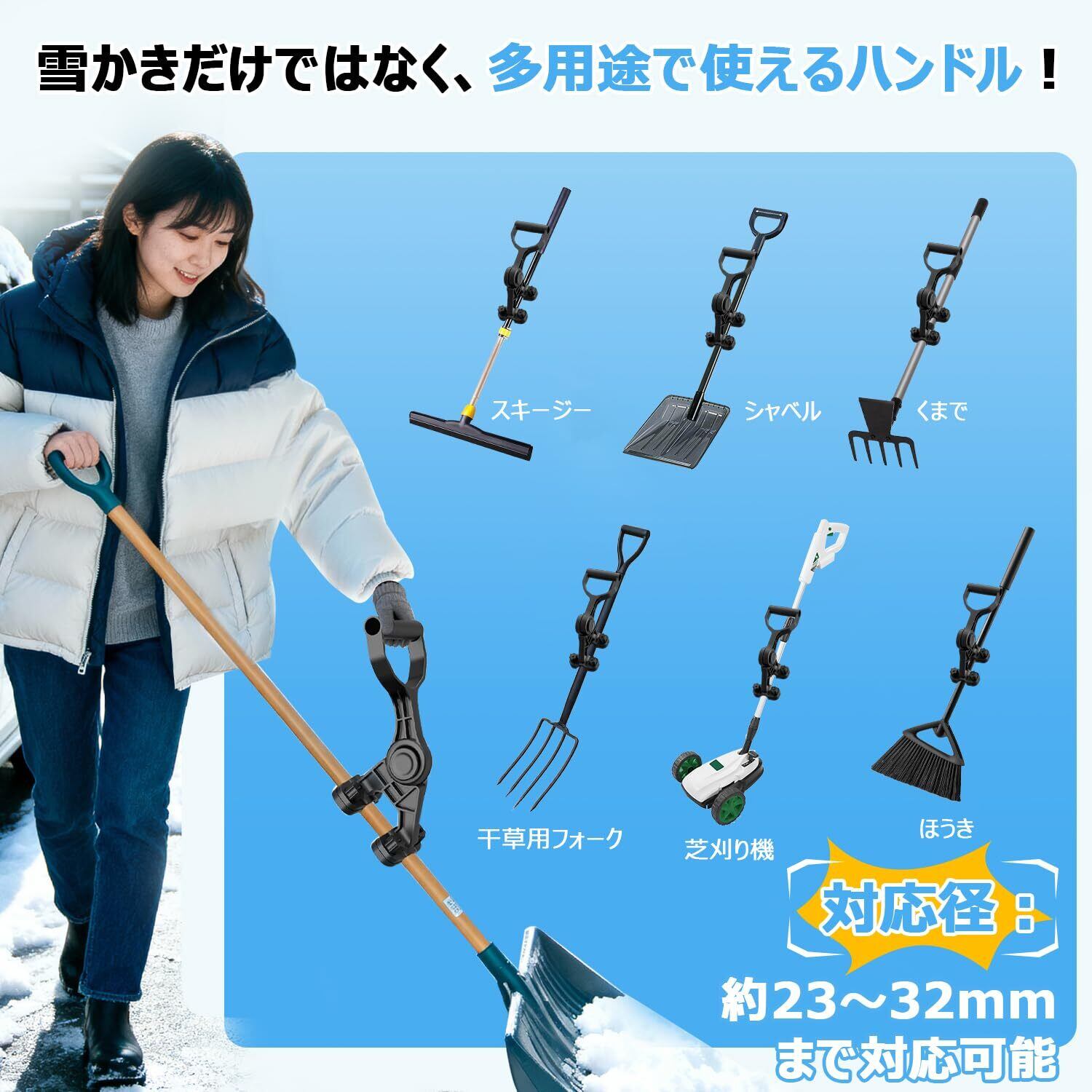 【多用途ハンドル】本製品は直径23mm以上〜約32mm以下 のスコップ・シャベルなどのハンドルに取り付け可能です。付属のシリコンパッドを使用することで、細いパイプにもぴったりフィットし、滑りを防止します。雪かきスコップや除雪シャベルなど、幅広い工具に対応する汎用タイプの補助ハンドルです。※本製品は補助ハンドル単品です。スコップ本体(雪かきシャベル)は含まれておりません。