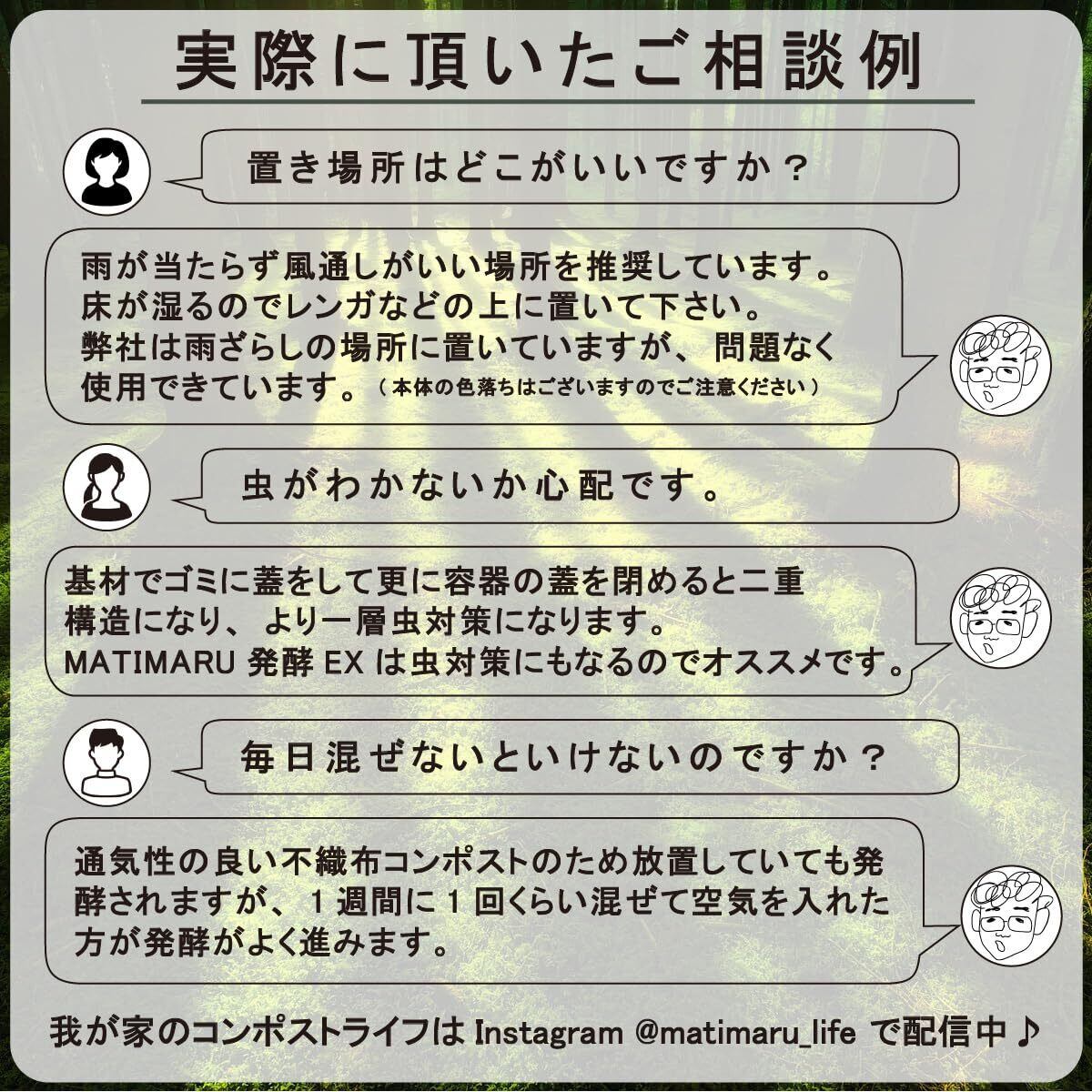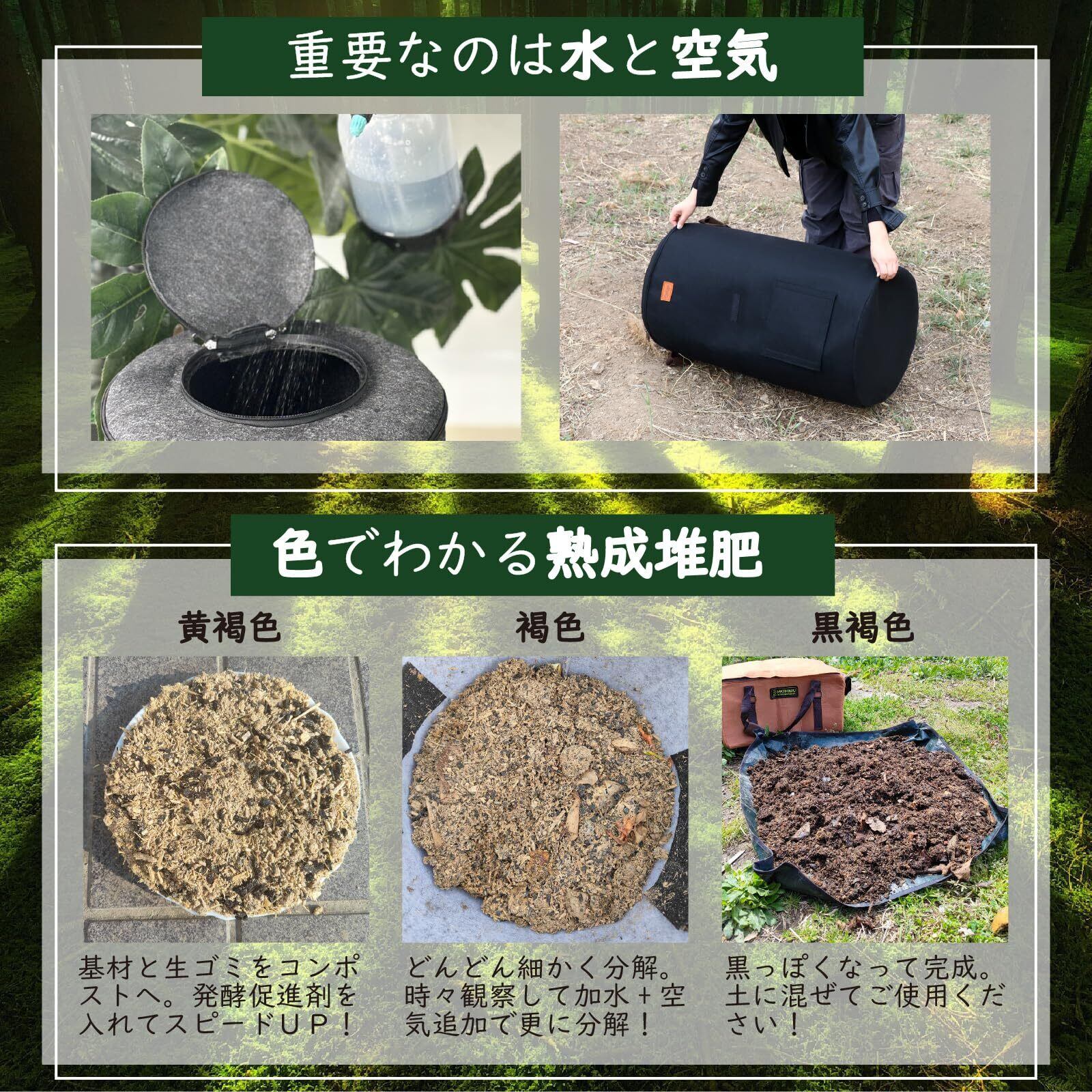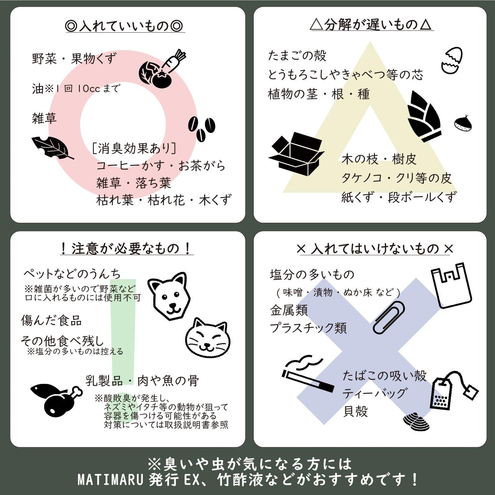 ■マティマルコンポストのひみつ 一般的なコンポストは密閉されていて腐敗しやすい傾向にありますが、**マティマルは「通気性の良い不織布」でできています。**余分な水分を外に出し、容器の無数の穴から微生物を取り込むことで、生ごみがスムーズに分解されます。 マティマルコンポストで、今日から環境にやさしい暮らしを始めませんか。