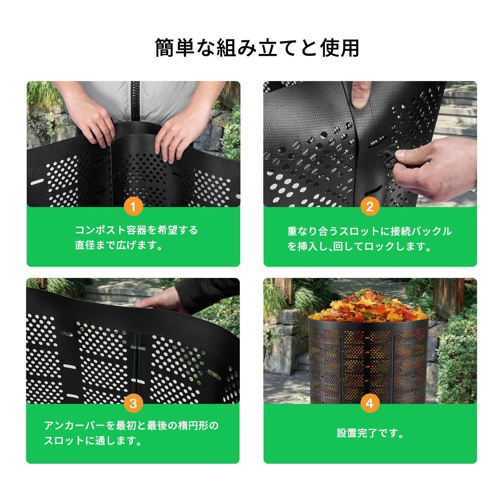 【再利用可能】堆肥化が完了したら、簡単に分解して再利用することができ、必要な場所で再び堆肥作りを行うことが可能です。再利用することで、環境に優しく、菜園や庭に栄養豊富な土壌を提供します。
