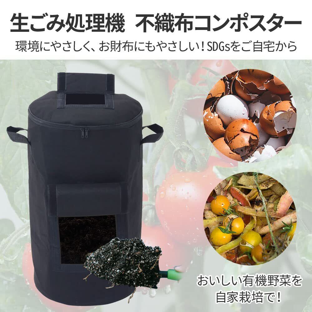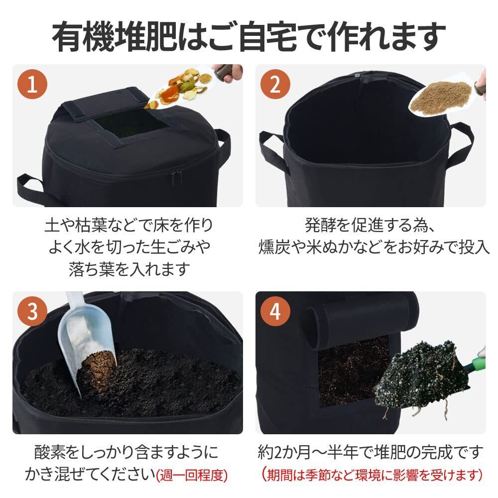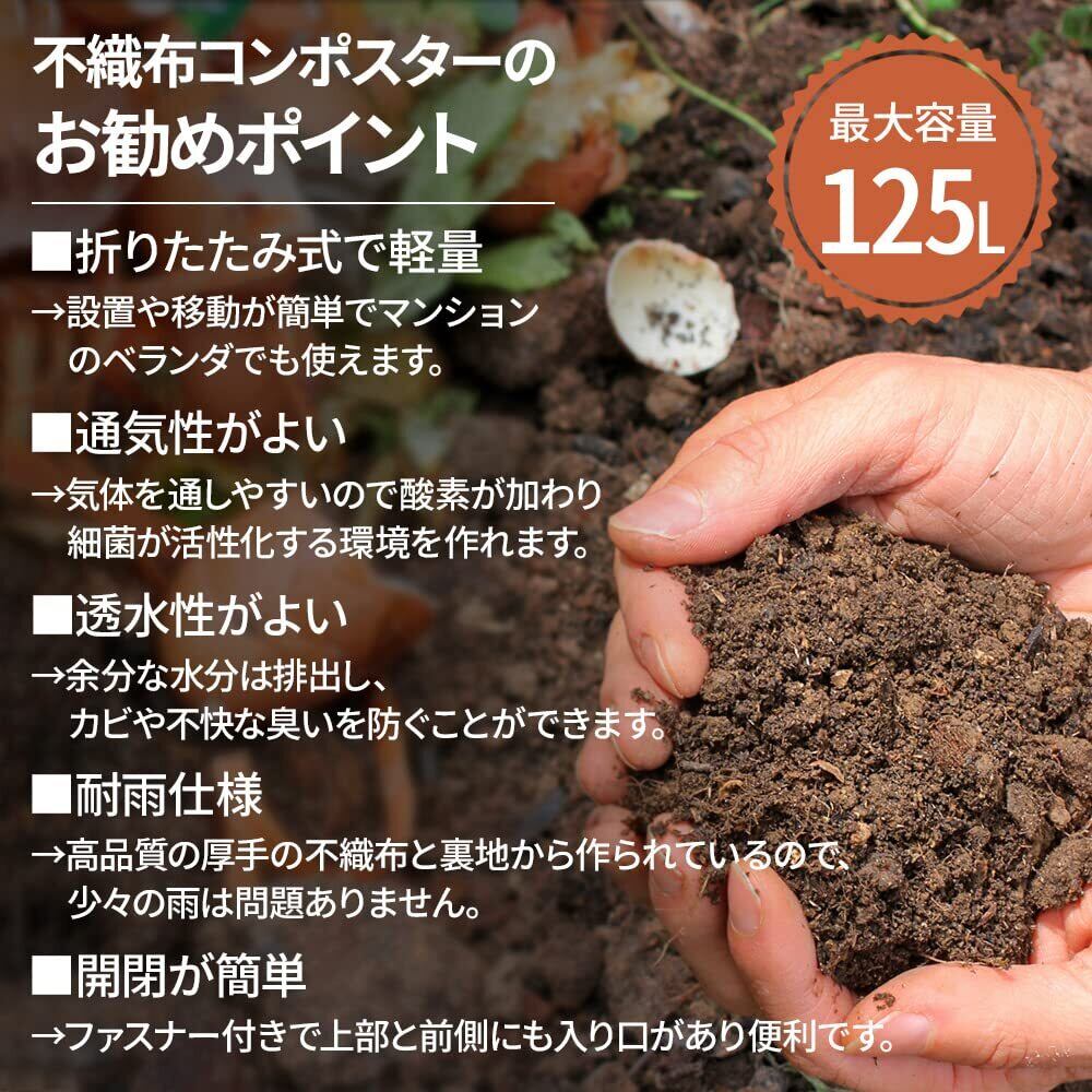 【不織布生地のメリット】 厚手の布生地で作られているため、例えばスコップで中身をかき回す際にも傷や穴があきにくいです。 通気性がよいので、気体を通しやすく、酸素が加わり細菌が活性化する環境を作れます。 透水性がよいため、余分な水分は排出し、プラスチックの商材に比べ、カビや不快な臭いを防ぐことができます。