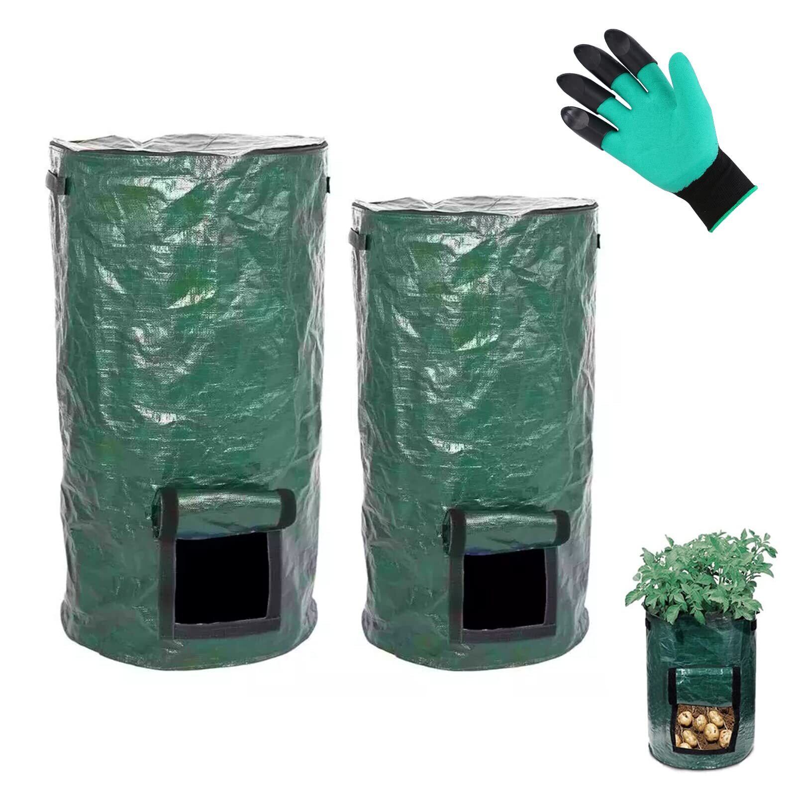 コンポスト 2点セット コンポスト バッグ ガーデン用 植え袋 コンポスト 容器 落ち葉処理 肥料袋 屋外 堆肥 廃棄物処理 生ゴミ 発酵 脱臭 家庭用 園芸用 爪付き作業手袋 折り畳め 大容量 自立式 再利用可能