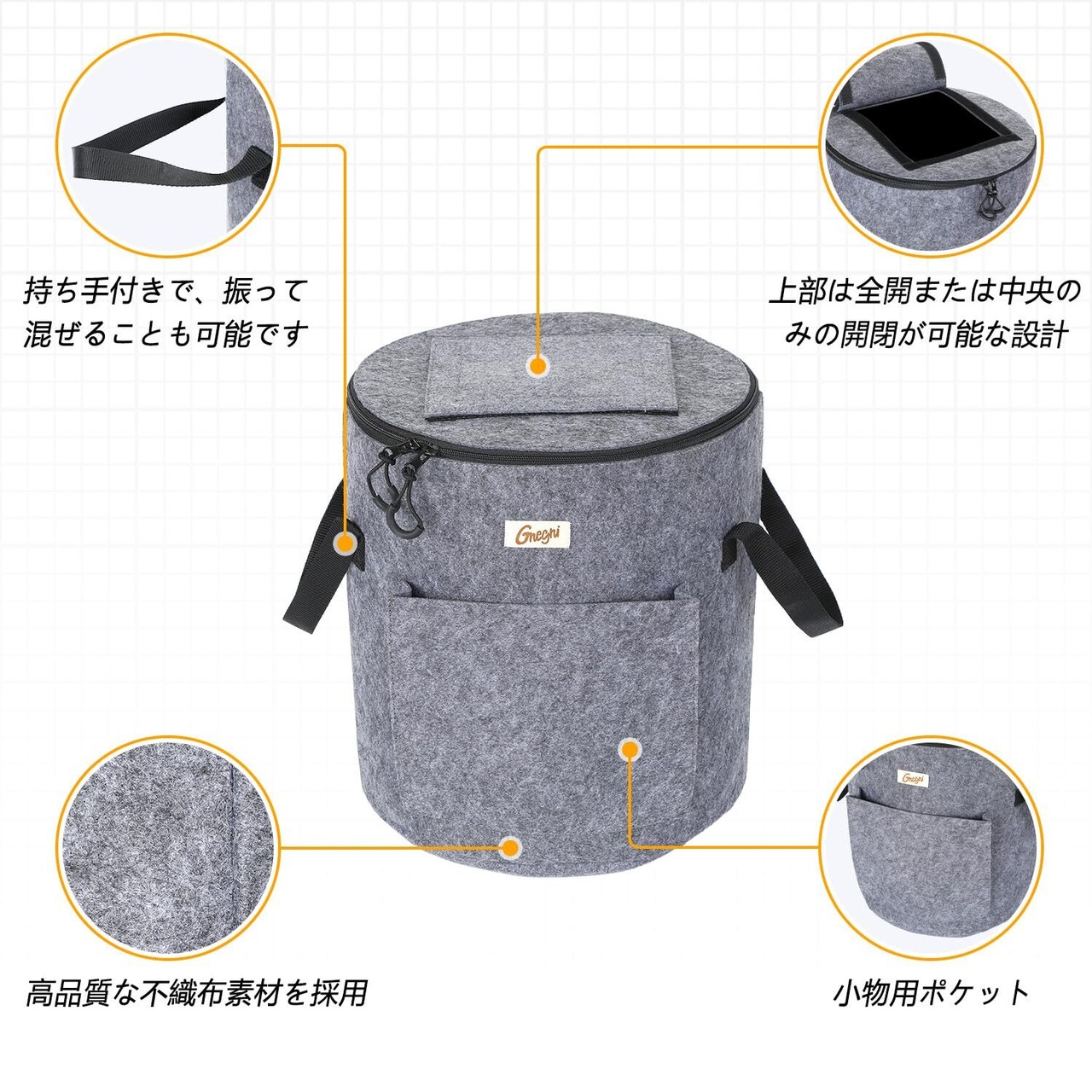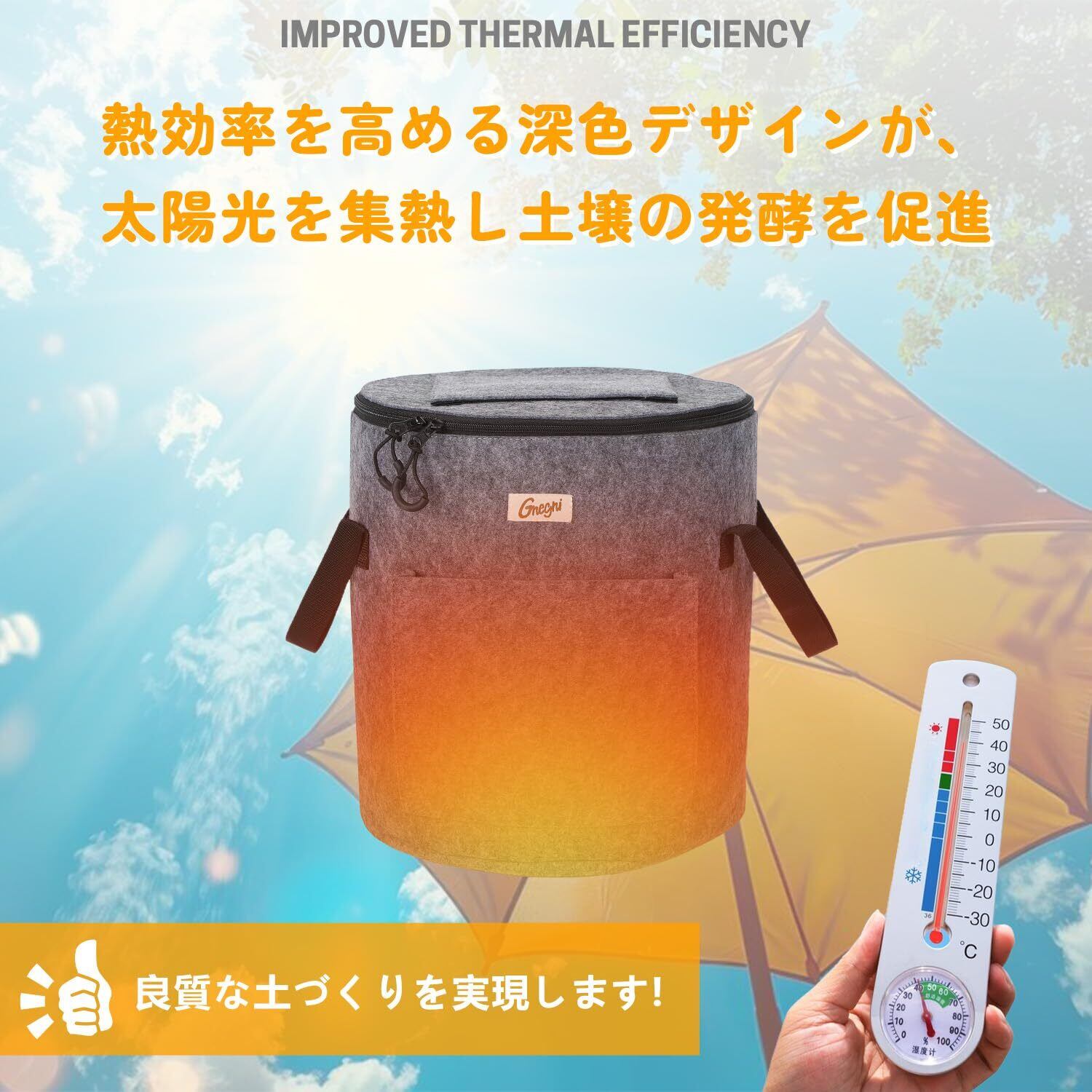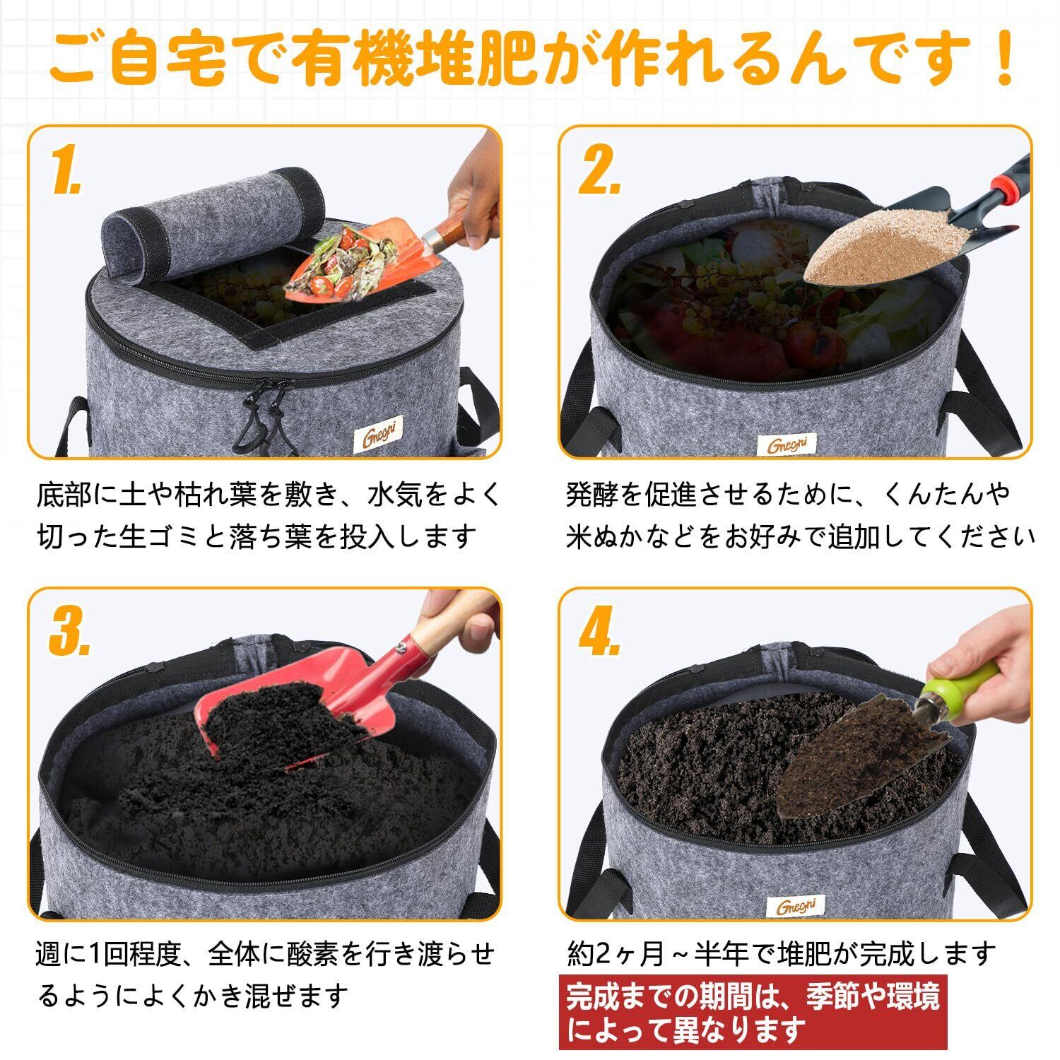 【不織布のメリット】通気性&排水性で臭わずラクチン ・厚手不織布が余分な水分を自動排出、カビや嫌な臭いを大幅軽減 ・プラスチック製より発酵が早く進む(比較実験で約20%短縮※データあれば記載) ・スコップでかき混ぜても破れにくい耐久性