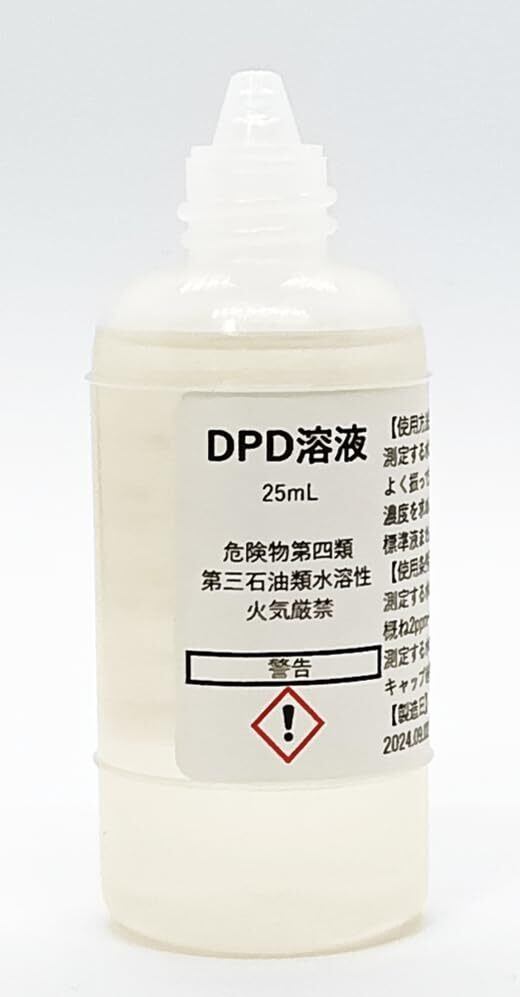※本品は低濃度の遊離塩素(2mg/L以下)を定量するための試薬です。高濃度の塩素はDPD試薬では定量出来ません。なお、高濃度の簡易塩素分析は各社市販のヨウ化カリウム法を用いた塩素試験紙などで分析出来ますが、こちらでは取扱いございません。 【使用方法】測定する水10mLあたりに本品を1滴加えて下さい。よく振って速やかに呈色を確認して下さい。濃度を求める場合は遊離残留塩素標準比色列(Acid Red 265標準液またはこれに準じた比色板)と比較して下さい。