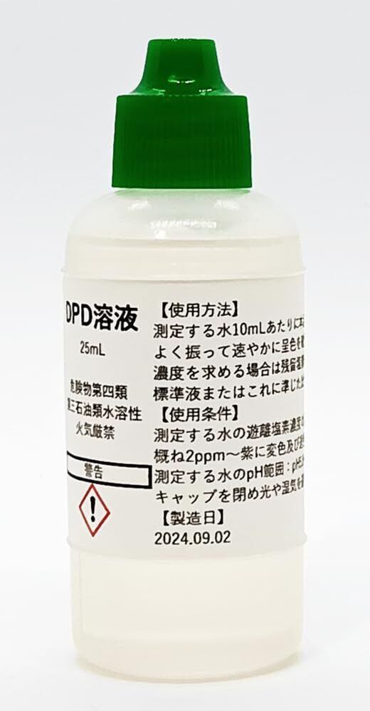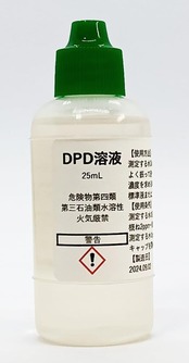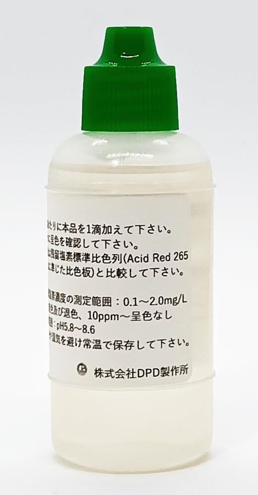 ※本品は低濃度の遊離塩素(2mg/L以下)を定量するための試薬です。高濃度の塩素はDPD試薬では定量出来ません。なお、高濃度の簡易塩素分析は各社市販のヨウ化カリウム法を用いた塩素試験紙などで分析出来ますが、こちらでは取扱いございません。 【使用方法】測定する水10mLあたりに本品を1滴加えて下さい。よく振って速やかに呈色を確認して下さい。濃度を求める場合は遊離残留塩素標準比色列(Acid Red 265標準液またはこれに準じた比色板)と比較して下さい。