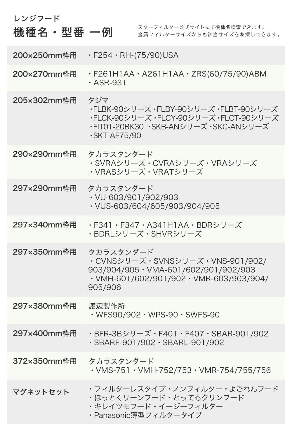 ●297×290mm枠用:タカラスタンダード VU-603/901/902/903、 VUS-603/604/605/903/904/905●297×340mm枠用:F341、F347、A341H1AA、BDRシリーズ、BDRLシリーズ●297×350mm枠用:VNS-902/903/904/905、SVNS-902/903/904/905、VMH-601/901、VMR-905/906●297×400mm枠用:F401、SBAR-901/902、SBARF-901/902、SBARL-901/902●372×350mm枠用:VMH-752/753、VMR-754/755/756●マグネットタイプ:フィルターレスタイプ、ノンフィルター、よごれんフード、ほっとくリーンフード、とってもクリンフード、キレイツモフード、イージーフィルタ