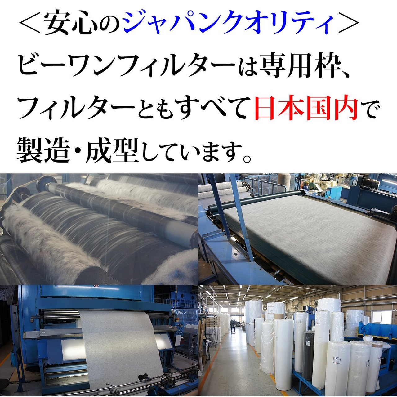 フィルターは日本国内のみで製造・成型している100%JAPANクオリティ。ミクロバーナー法を遵守し防炎性能を確認済です。※ガラス繊維のフィルターは粉々になったガラスを吸い込むリスクがありましたがビーワンフィルターは不織布なので破片が空気中を舞うこともありません。