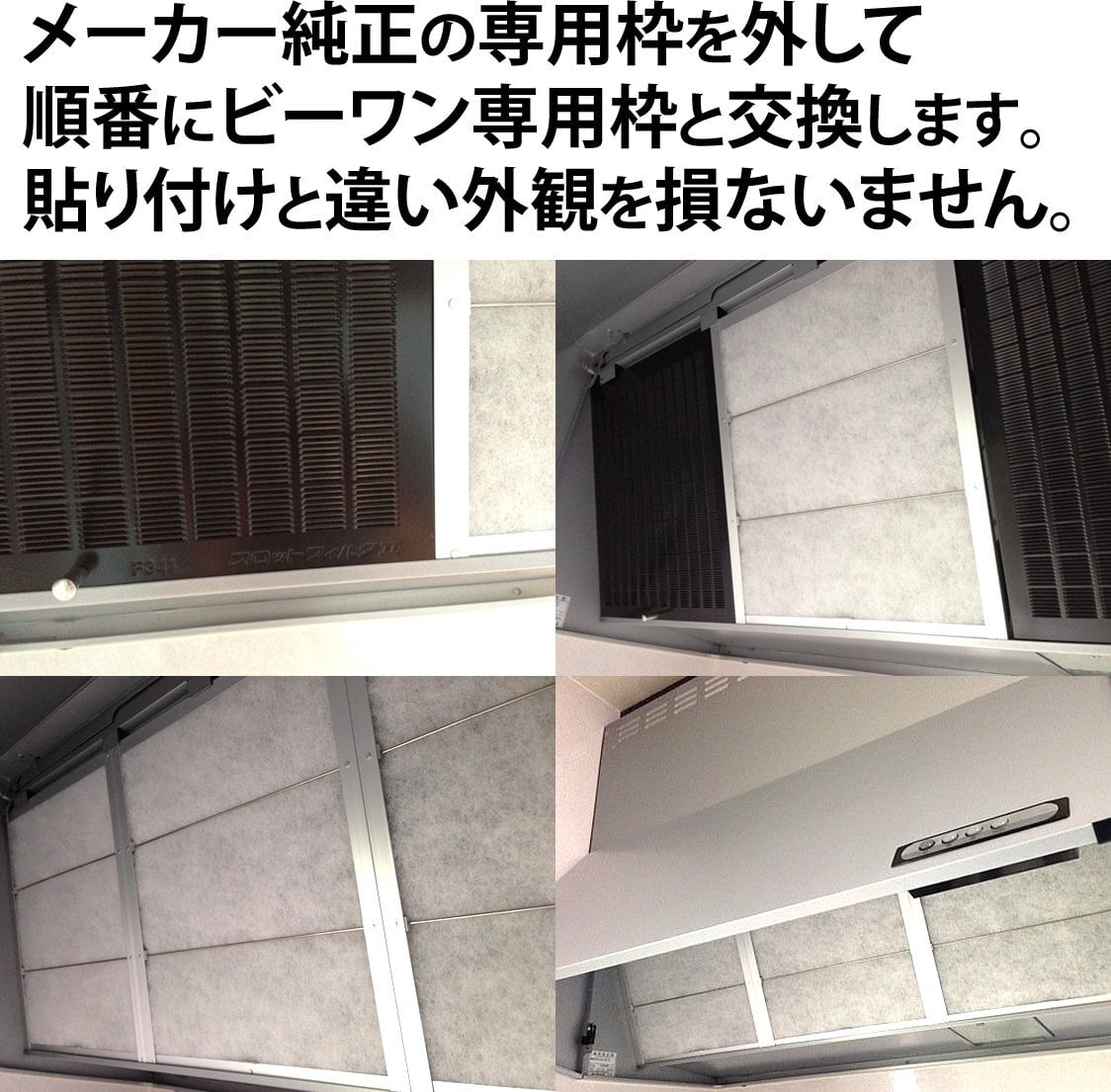 メーカー純正の金属フィルターや市販の貼り付けタイプの薄いフィルターではほとんどの油が換気扇内に入り、お掃除が大変でしたが、厚さ1cmのビーワンフィルターを設置するだけでほとんどの油煙を内部に侵入させずに吸収してくれます。使い捨てだから手間もかかりません。