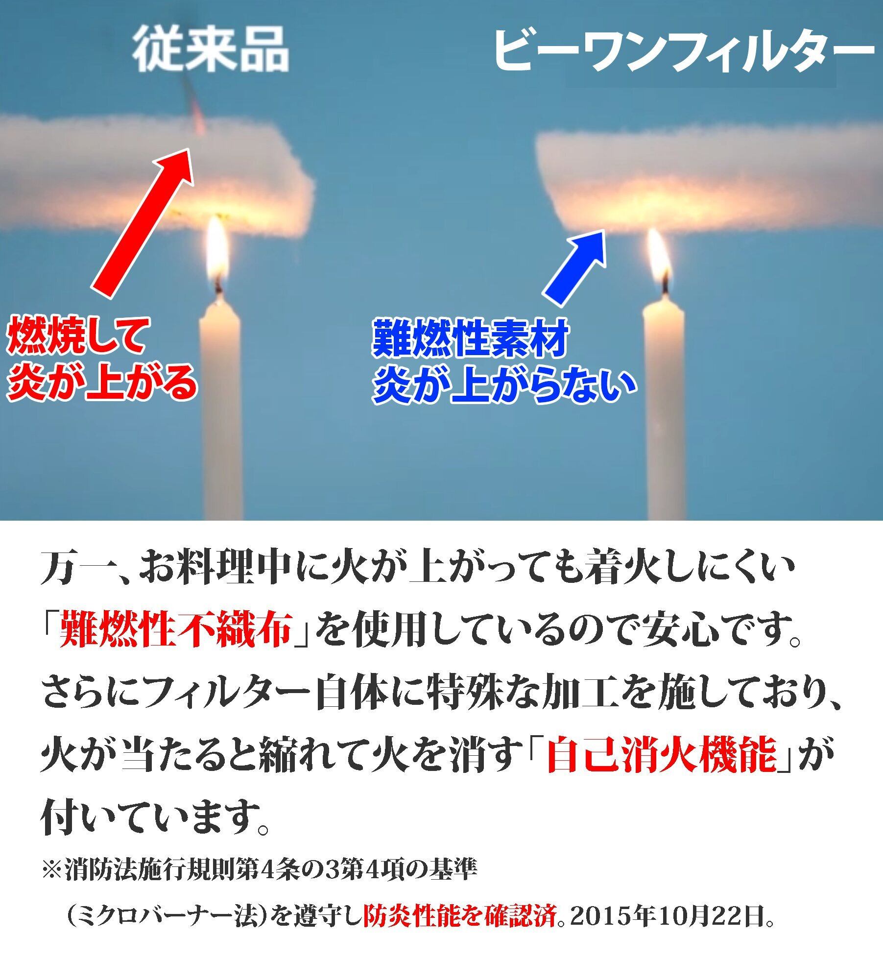 ご使用には、専用枠が必要です。同じような専用枠をお持ちの場合は、そのままご使用になれます。 特厚1cmだからお料理中に発生する油煙の油だけを吸収。きれいになった空気だけをレンジフード内やダクトに通すのでフード内のダクトが劇的に汚れなくなり、換気扇そうじを大幅に省くことができます。フィルターには難燃性不織布を使用し自己消火機能までもたせた日本製の高品質な換気扇フィルターです。破片を吸うリスクを回避するためにあえてガラス繊維は使用せずポリエステル100%でも炎が上がらない特殊な製法で成型しています。消防法施行規則第四条に則り防炎性能を確認済です。フィルター販売25年の高品質な使い捨て換気扇フィルターです。