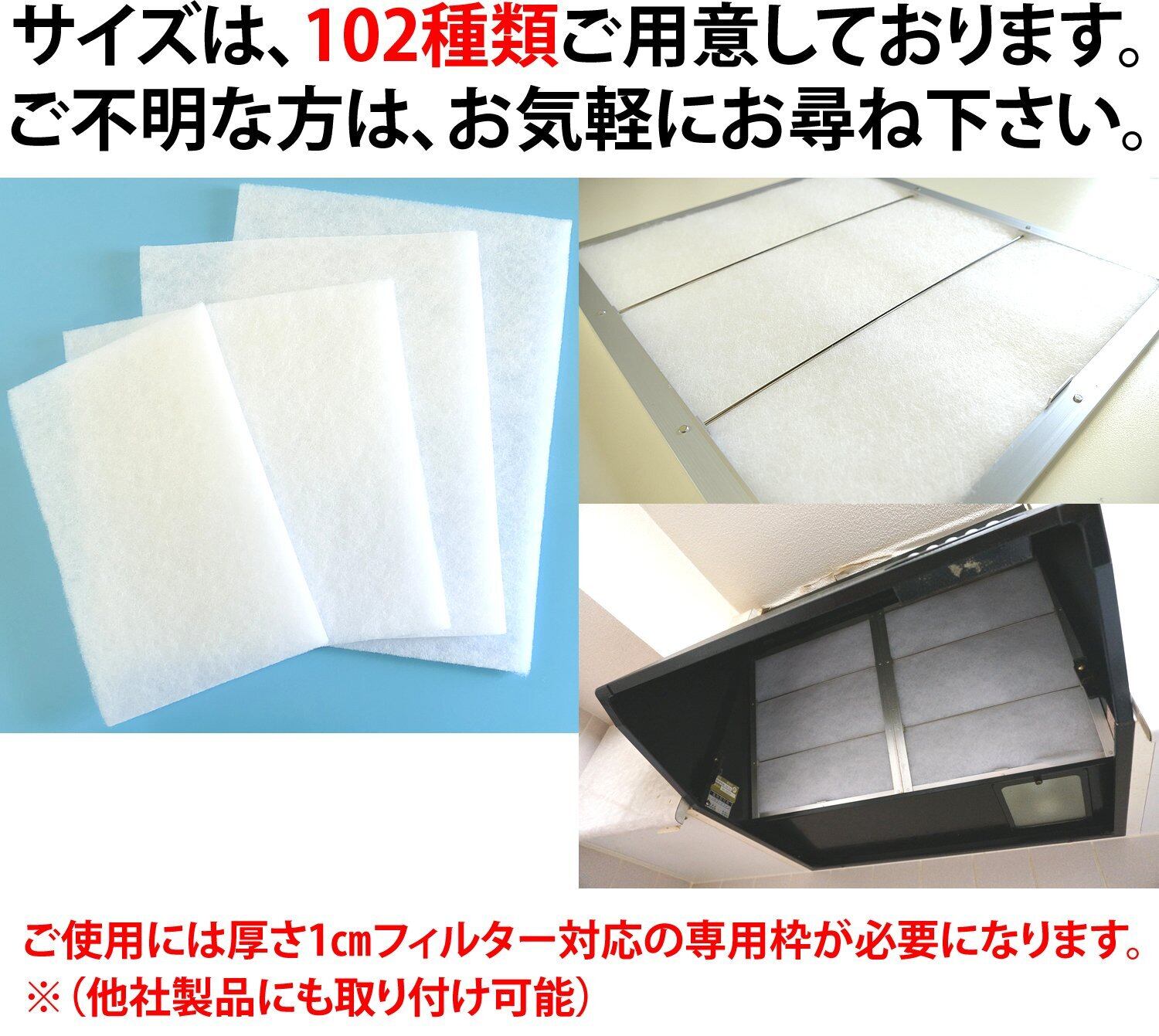 フィルター販売25年だからご家庭のレンジフードに合わせて様々なサイズを取り揃えております。現在は102種類に対応。サイズがご不明な場合はお気軽にお尋ねください。