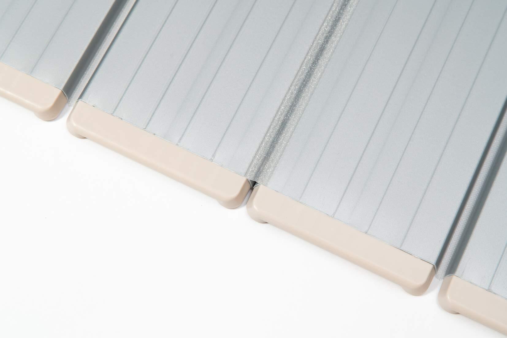 ●溝を約7割減らし(当社従来品対比)、蛇腹状シャッター(シャッター式)ふたの不満を解消した折りたたみ風呂ふたは、広げた状態でフラットになるので掃除も簡単です。