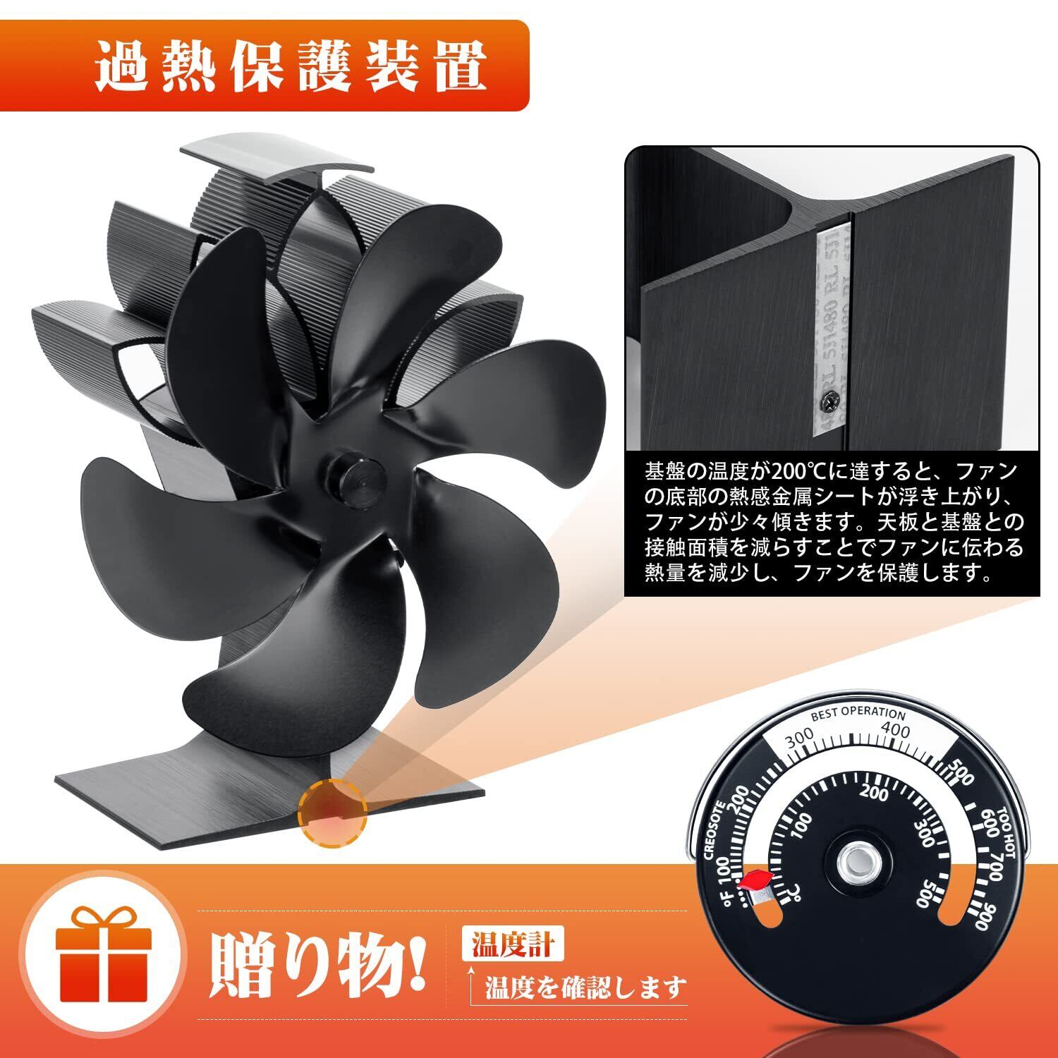【過熱保護】基盤の温度が200℃に達すると、底部の熱感金属シートが浮き上がり、ファンが少々傾きます。ストーブ天板と基盤との接触面積を減らし、長時間の高温からファンを保護します。よりよく温度を観察するため、マグネット式温度計が付属されます。