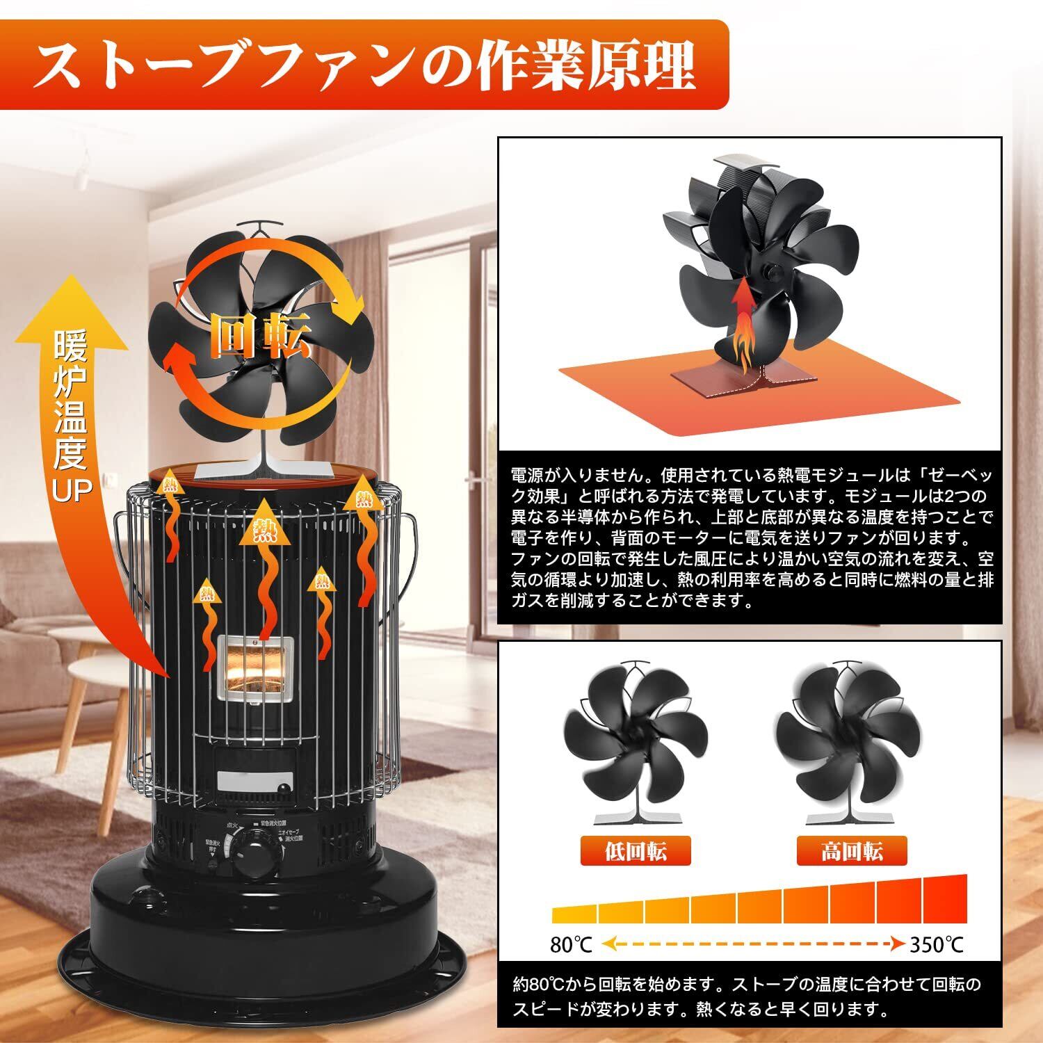 【注意】ストーブファンの稼働温度は80℃~350℃を推奨します。石油ストーブまたは薪ストーブを利用する場合、天板中央部の温度が推薦温度を超える可能性があるため、ファンを設置する際は天板中央部から離れる場所に設置し使用してください。また、稼働中に製品は熱くなりますので、素手で触れないようご注意ください。幼児やペットの手の届かない所に保管、使用してください。火傷や回転する羽根でケガする恐れがあります。