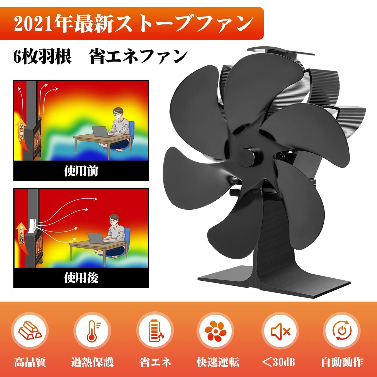【高転換率】改良された後高性能な熱電モジュールモジュール及び静音式モーターを採用し、耐熱強度がアップされ、熱と電気の転換効率が上がります。羽根の回転によるノイズも30dB以下です。6枚羽根のデザインで風圧をより強くし、室内の空気循環をより早くします。4枚羽の物より熱利用率が高いです。