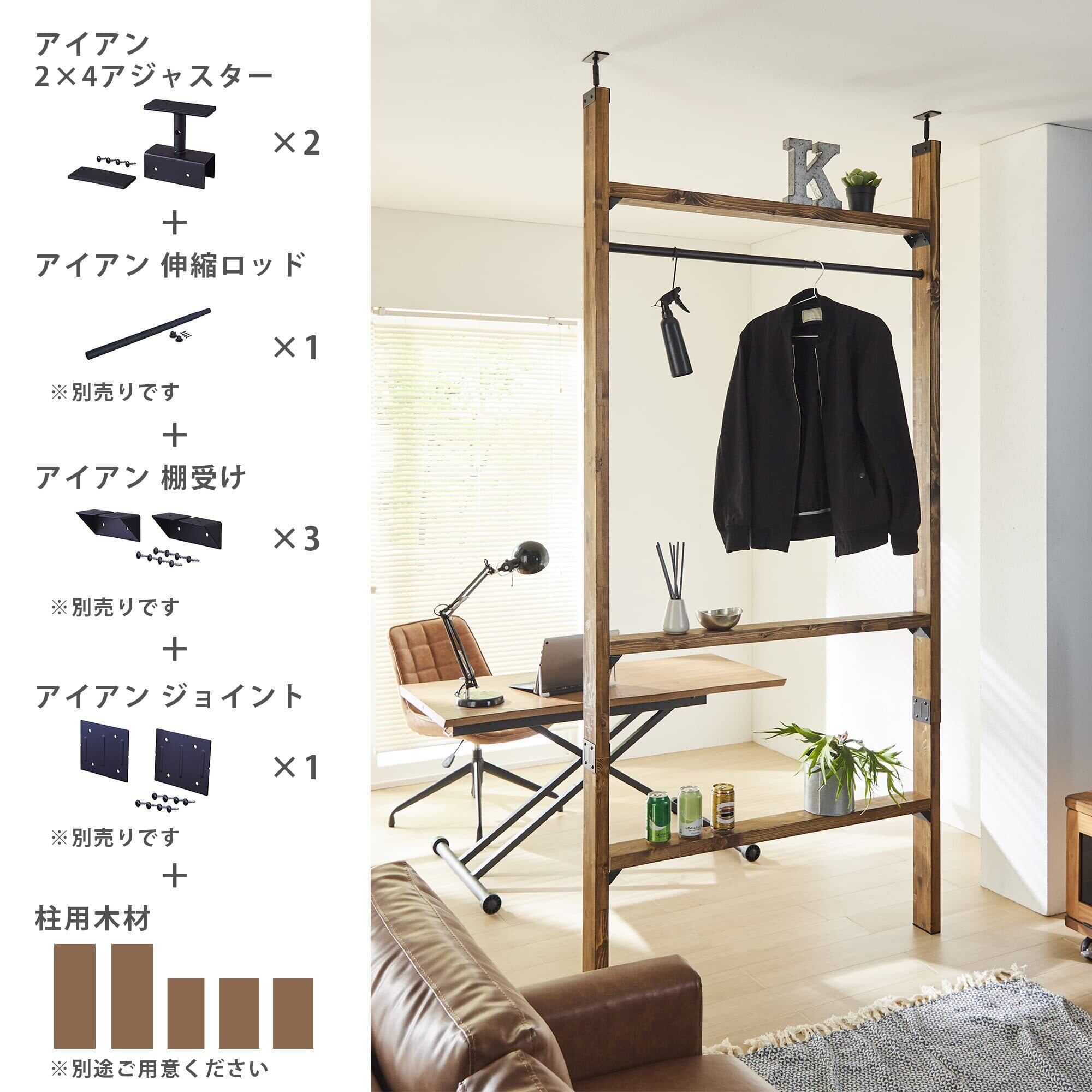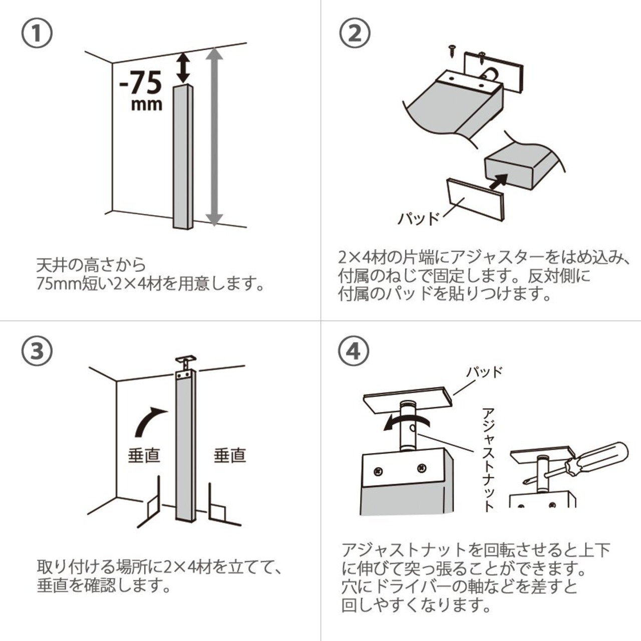 【対応木材】2×4木材【取付寸法】高さ2750mmまで【木材カットの目安】天井の高さから75mm短い木材をご用意ください。