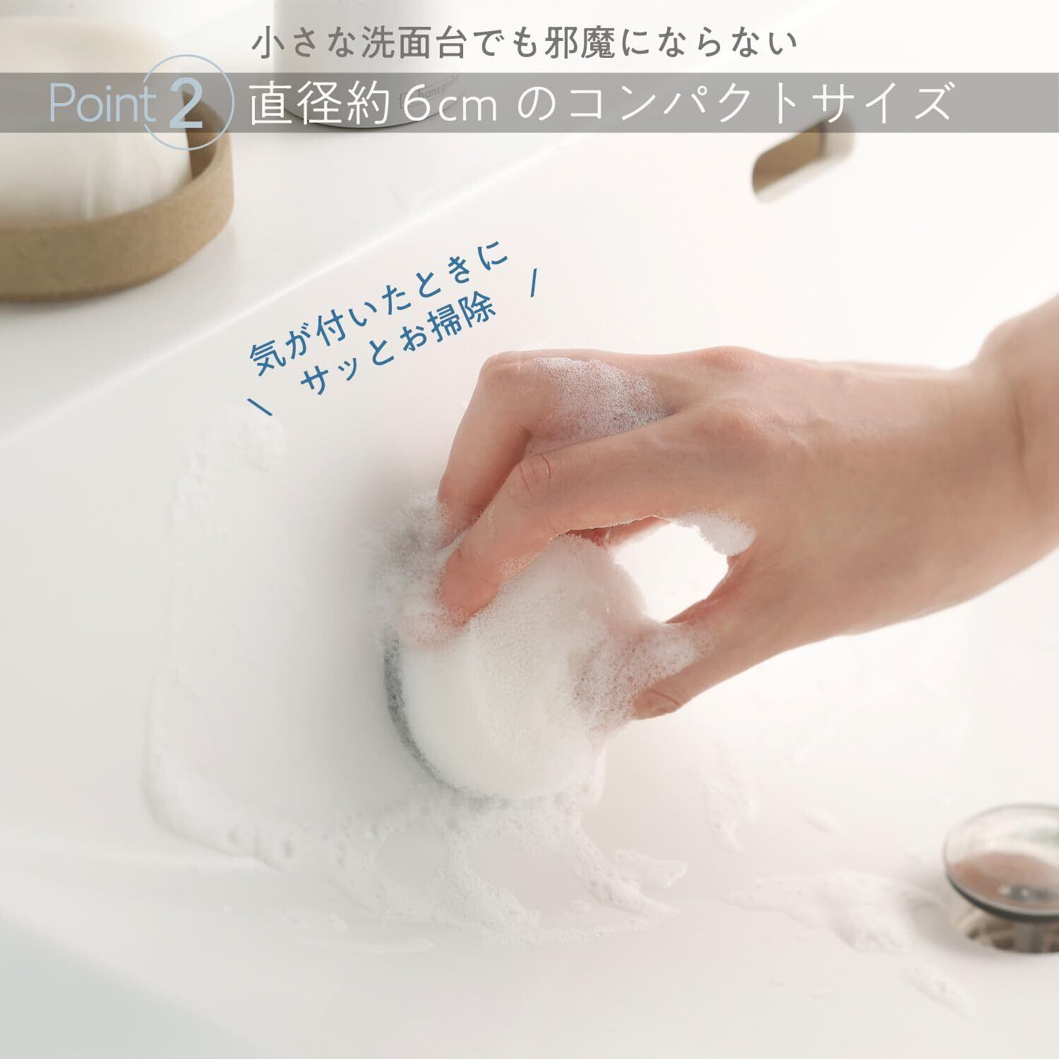 【吸盤でポコっと浮かせて収納】洗面台まわりの好きな位置に取り付けられるスポンジと吸盤のセットです。洗面所のインテリアを邪魔しないシンプルなデザインで、気になったときに洗面台をササッと掃除できます。※吸盤は別売りになります。
