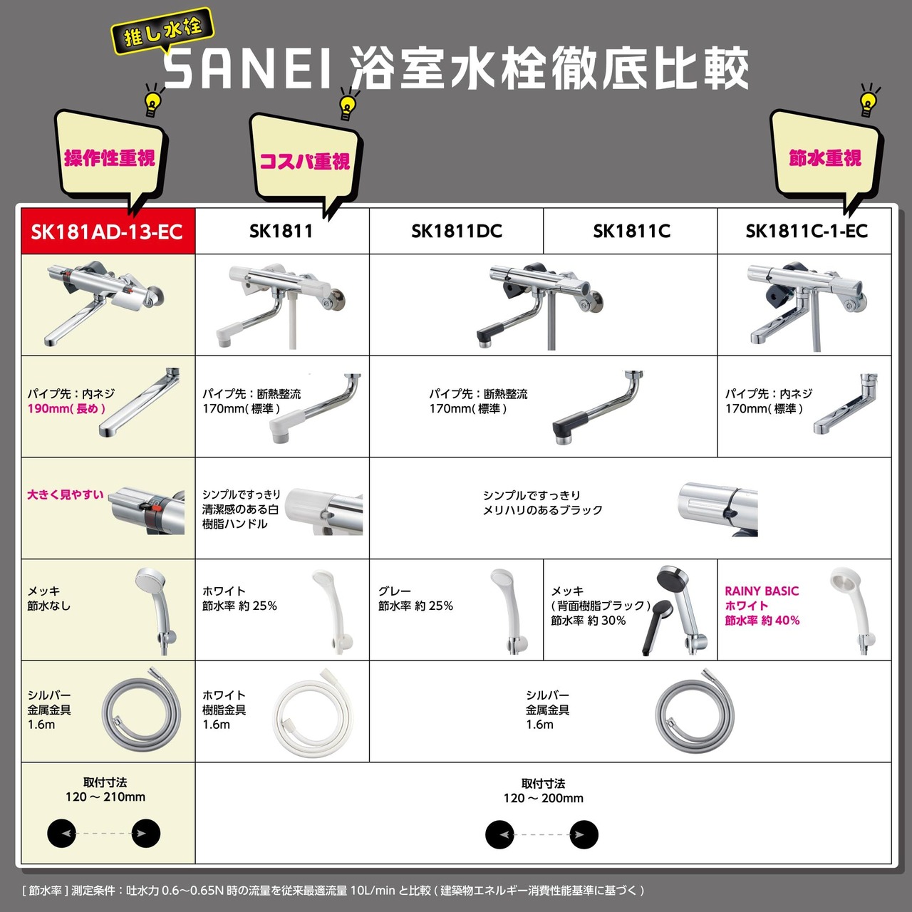 シャワーホースの長さ:1.6m パイプの長さ:190mm 取付寸法:120~210mm