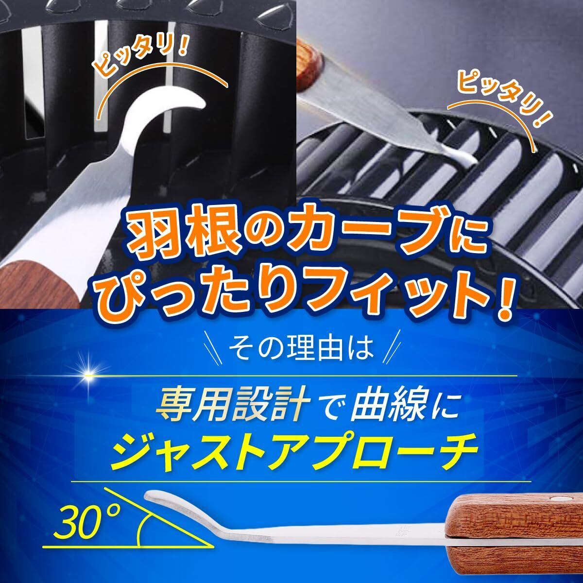 【充実のセット内容・これひとつで徹底掃除】サイズ:全長約27cm/対応隙間幅約1.3cm以上 セット内容:スクレーパー本体、両端ワイヤーブラシ(幅広&細型)、ポイントリムーバー(ナイロン製/両端異形)、専用収納ケース このセット一つで羽根の隙間から細部の仕上げ、片付けまで対応できる、使いやすさにこだわったフルセットです。※スクレーパーの持ち手部分には天然木を使用しており、木目や色味には個体差がございます。あらかじめご了承ください。