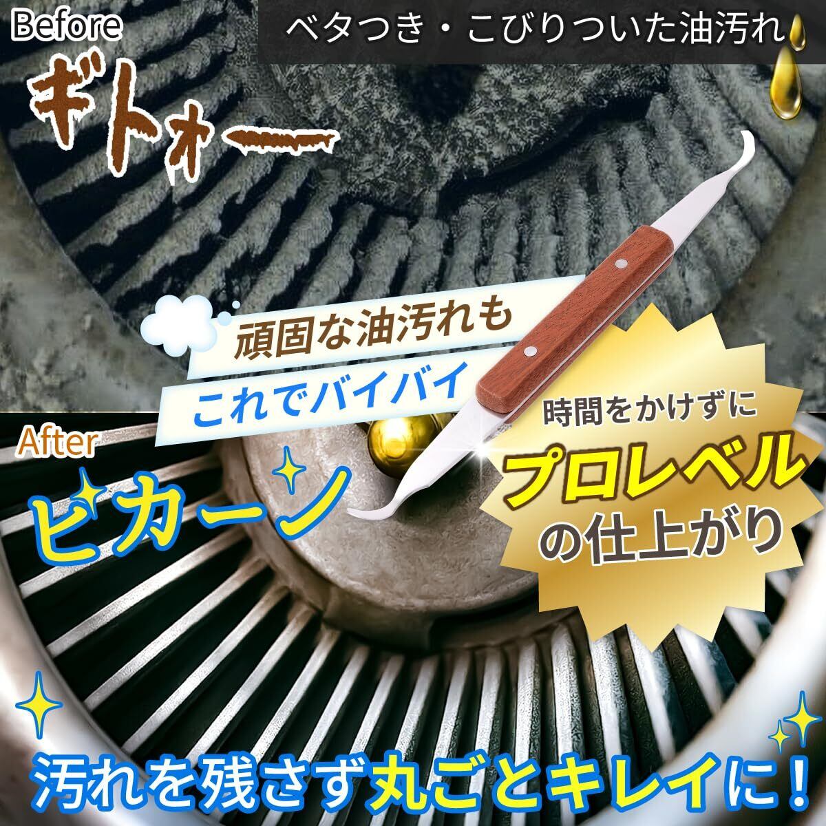 【頑固な油汚れも時短でしっかり除去】ベタついた油やホコリが固着した汚れも、専用形状のヘラで効率的に削ぎ落とせます。水やペーパーを併用することで、さらに汚れが落ちやすくなるため、ひどい汚れにはぜひ合わせてご使用ください。落としにくい汚れも短時間でスッキリ。掃除の負担を大きく軽減できます。