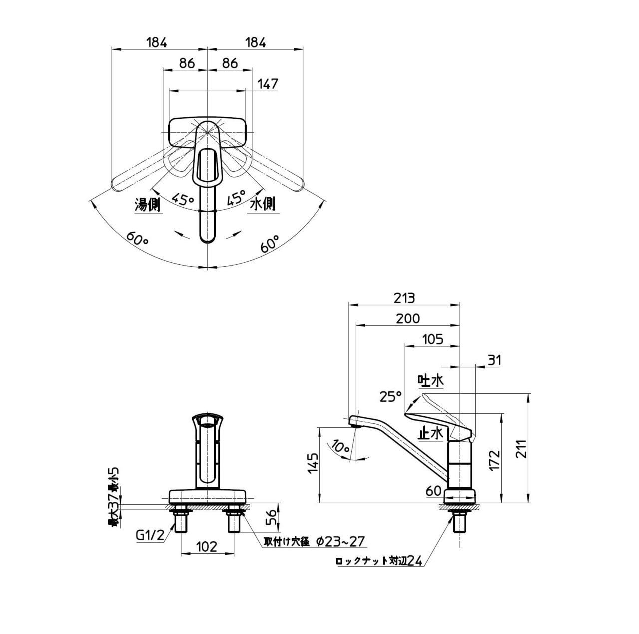 取り付け穴径23~27㎜、厚み5~37㎜、湯・水の芯ピッチ102mm。