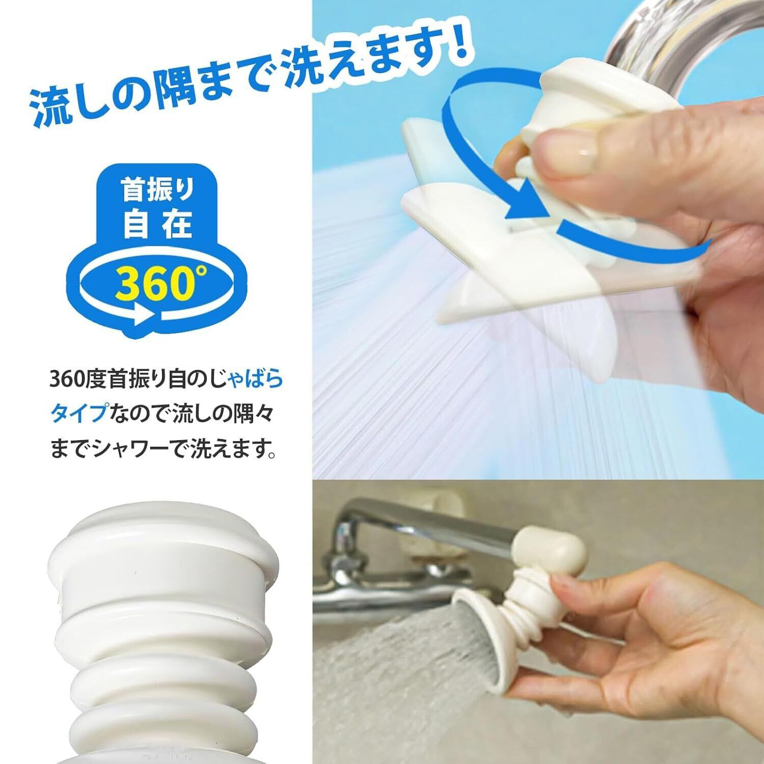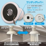 ワンタッチで水流が2タイプ(ストレート、シャワー)に変化する水道蛇口です。ストレートにしてもフィルター(中アミ)が入っており、水はねしません。本体が蛇腹なので、流しの隅々までシャワーで洗うことができて清潔。食器・野菜洗いに威力を発揮します。材質は合成ゴムなので耐久性に優れていて、お湯(90℃以下)の使用もOK!