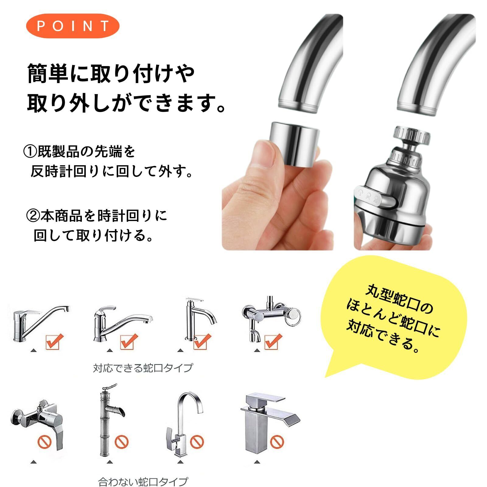 【取り付け簡単、水漏れ防止】必要なすべてのアクセサリが付属しているので専門工具も配管工も必要ありません。すべてのタイプの丸い蛇口に適しており、99%以上のタイプの家庭用キッチン蛇口で広く使用されています。 また、ネジの周りに適切な量のシールテープを巻くことで、漏水の心配がありません。蛇口シャワーヘッドは取り外せるので、取り外して洗浄可です。