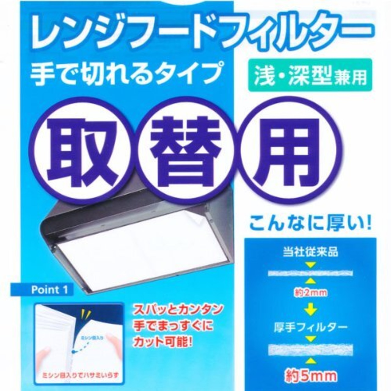 特徴:厚手フィルター(約5mm)により吸油力が約2倍! (従来品は約2.4mm)面倒な取替え回数が減ります!