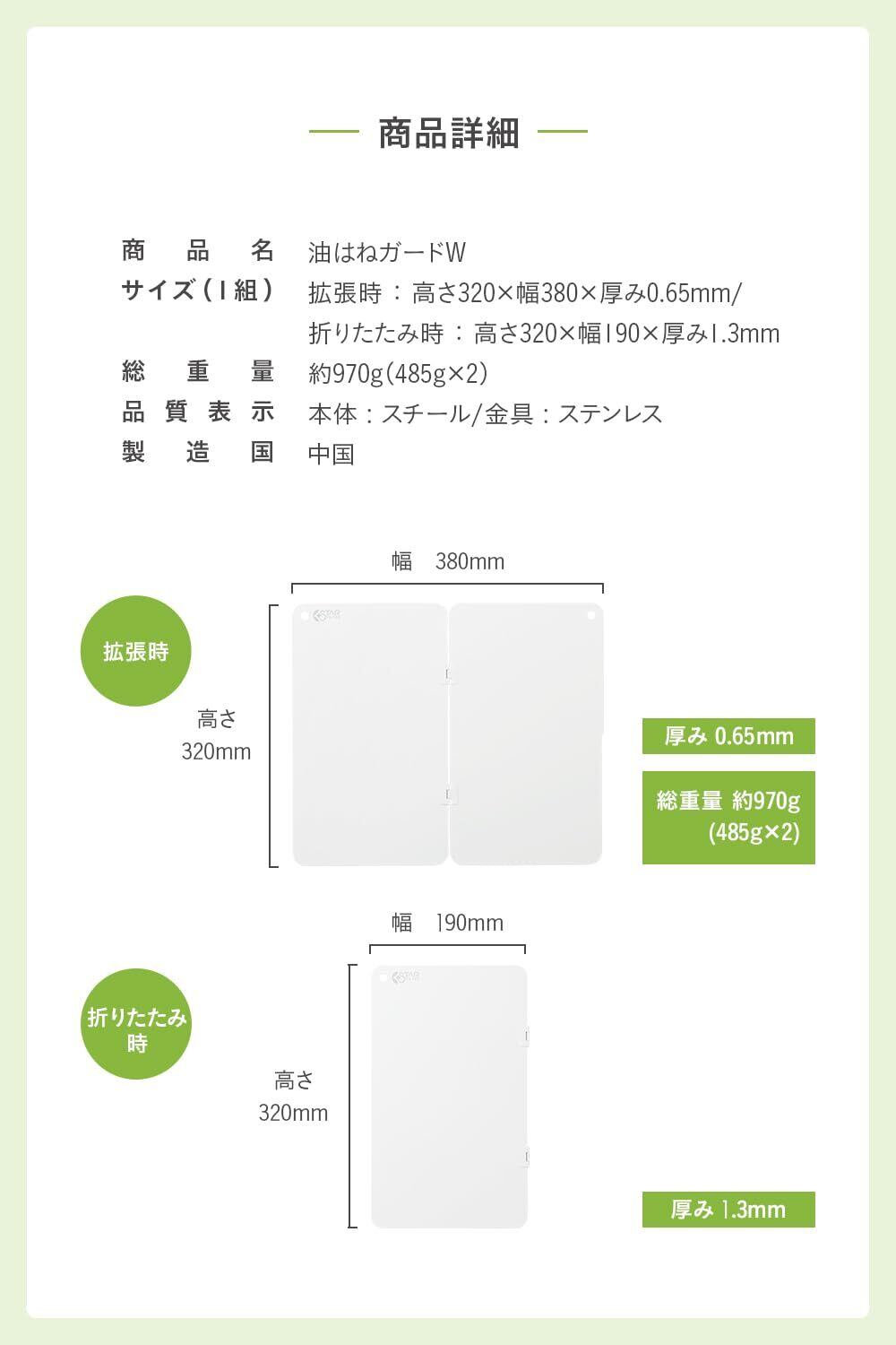 【2025年7月24日発売開始✨】 調理中の油はねを防ぐ人気のキッチンアイテム油はねガード。2枚ずつに分かれた構造で、調理スペースに合わせて柔軟に設置可能。IH・ガス対応、食洗機でも洗えてお手入れも簡単です。