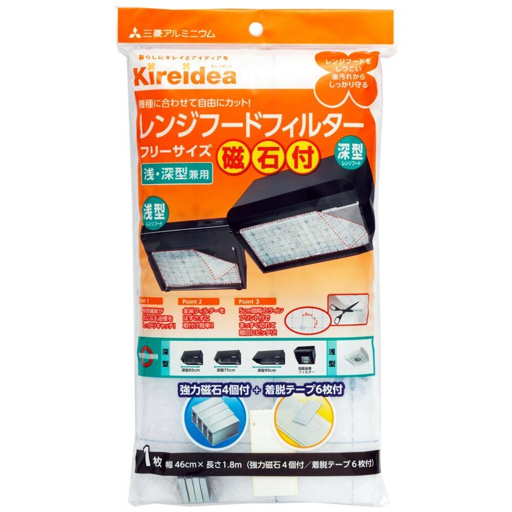 【新着商品】エムエーパッケージング Kireidea レンジフードフィルター フリーサイズ シルバー 日本製 46×180cm 浅・深型兼用 磁石4個 着脱テープ6枚付き