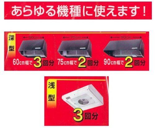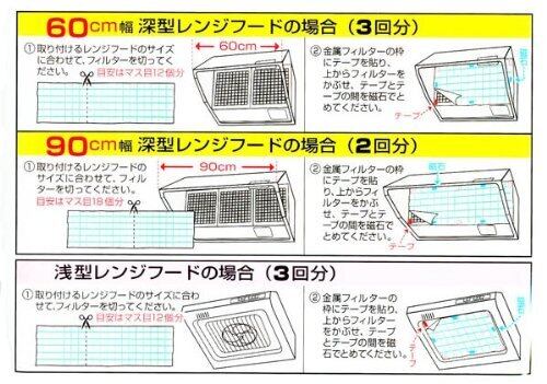 換気扇・レンジフードの汚れ防止に! ○5cm間隔のマス目入りなのでご使用のレンジフードのサイズに合わせてきれいにカットできます 60cm幅で3回分90cm幅で2回分です。○金属フィルターを外さずに簡単に取り付けや交換が出来ます。○燃やしてもダイオキシンを発生しない非塩素系フィルターです。