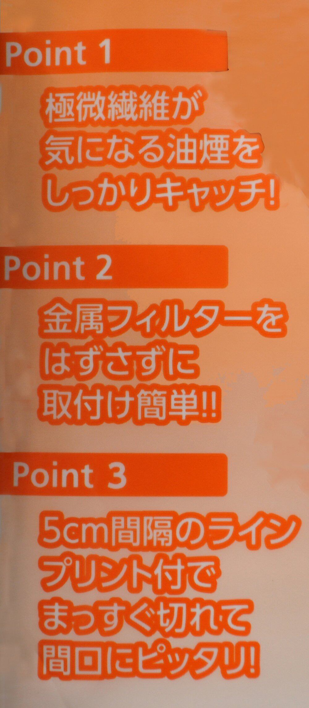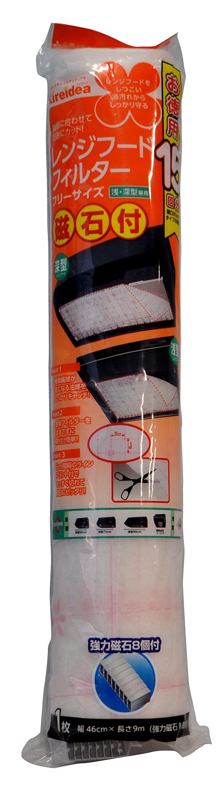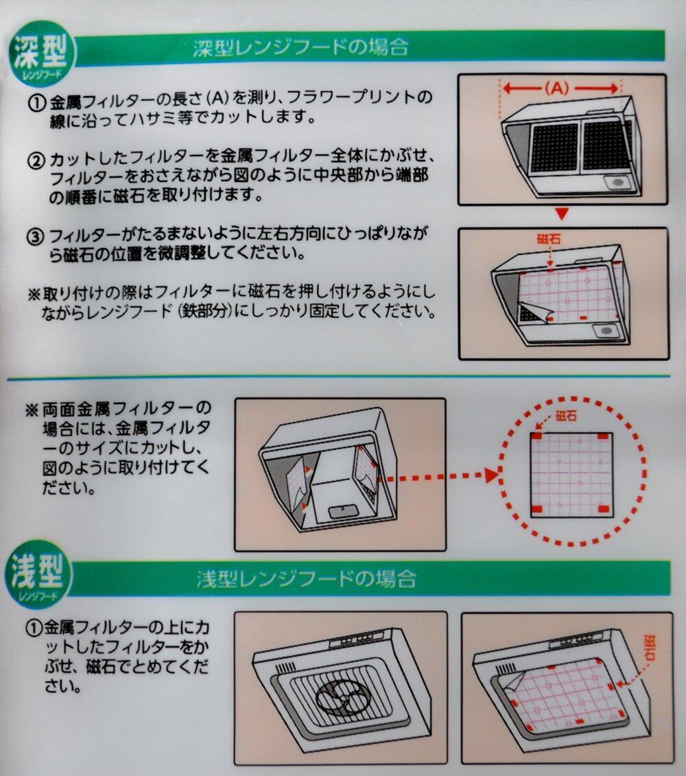 ●ご使用のレンジフードの開口サイズに合わせて、はさみで切ってお使いください●使用可能機種(深型タイプ):60cm15回分、75cm12回分、90cm10回分、両面金属フィルタータイプ11回分●使用可能機種(浅型タイプ):45cm20回分、60cm15回分●5cm間隔の格子状のプリントで、レンジフードの寸法に合わせて正確にカットできます●極微細繊維がレンジフードの機能を損なうことなく油煙をキャッチします●強力磁石8個付きで、金属フィルターを外さずに、簡単に取り付けや交換ができます●大気汚染の原因となる塩化水素・臭化水素・フッ化水素・Nox等の有毒ガスをほとんど発生しない非ハロゲン系フィルターを使用しています