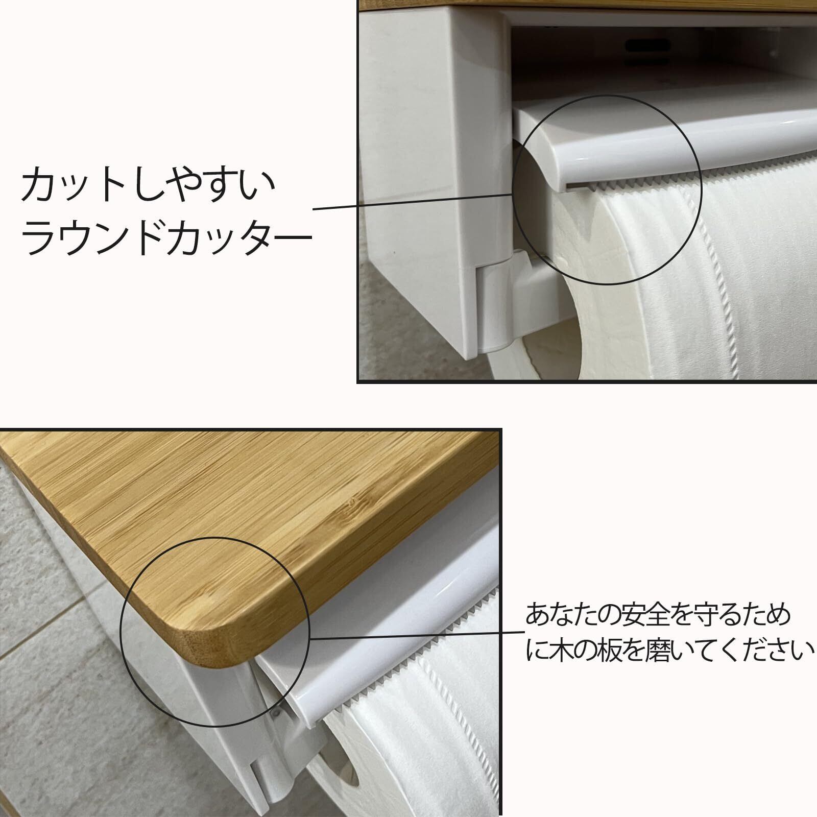 機能美の調和:シンプルモダンなデザインが洗面空間に洗練されたアクセントを追加。楠竹材の天然木目とABS樹脂の工業的質感が織り成すコントラストが独特の存在感を醸成。ペーパー収納・切断機能に加え、空間全体の快適性を向上させる衛生環境づくりをサポートします。