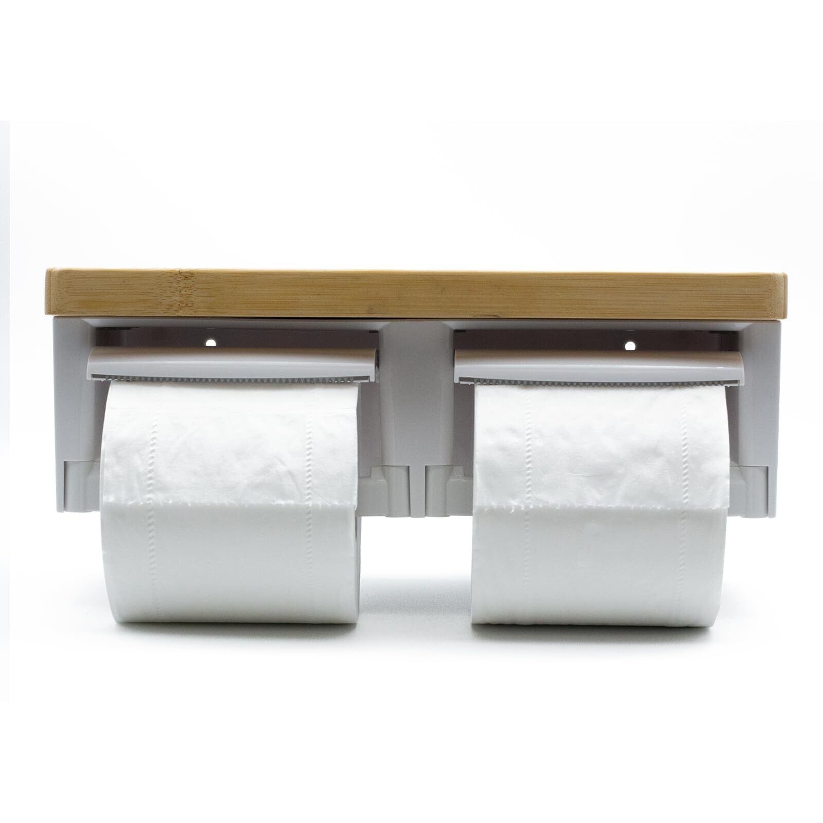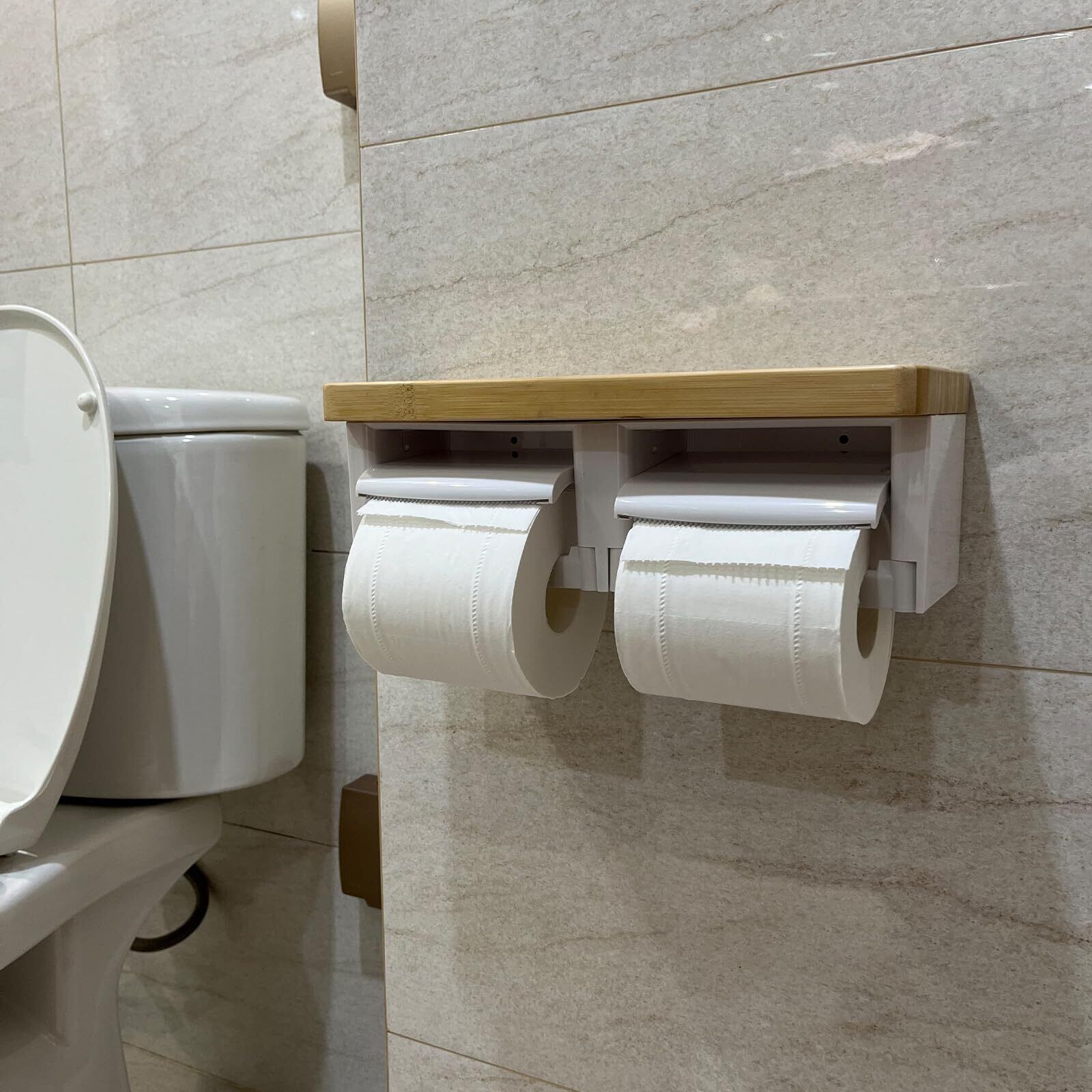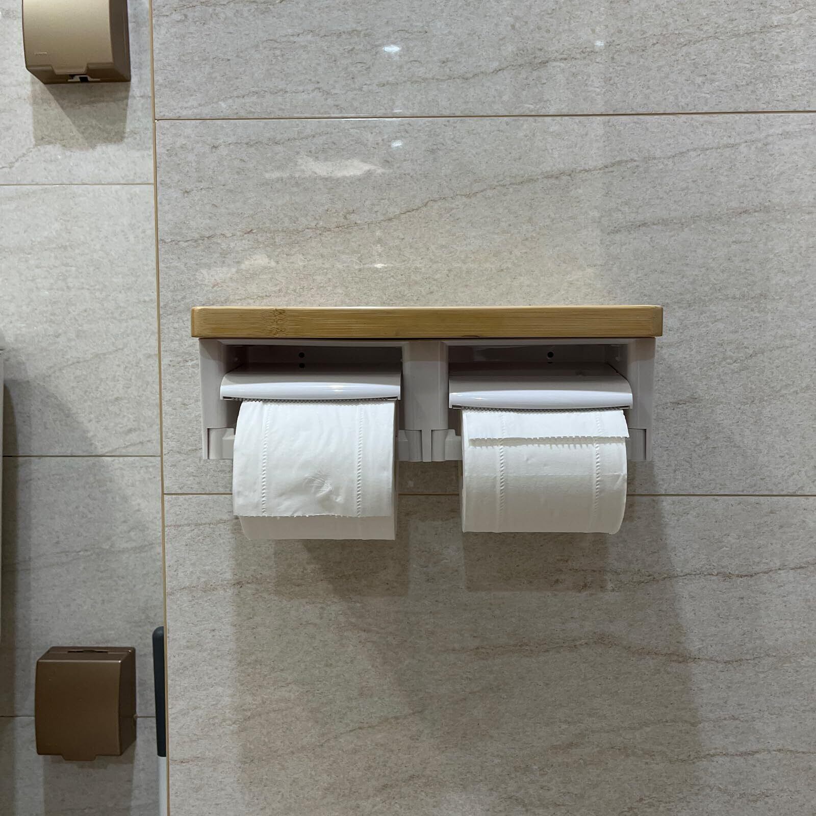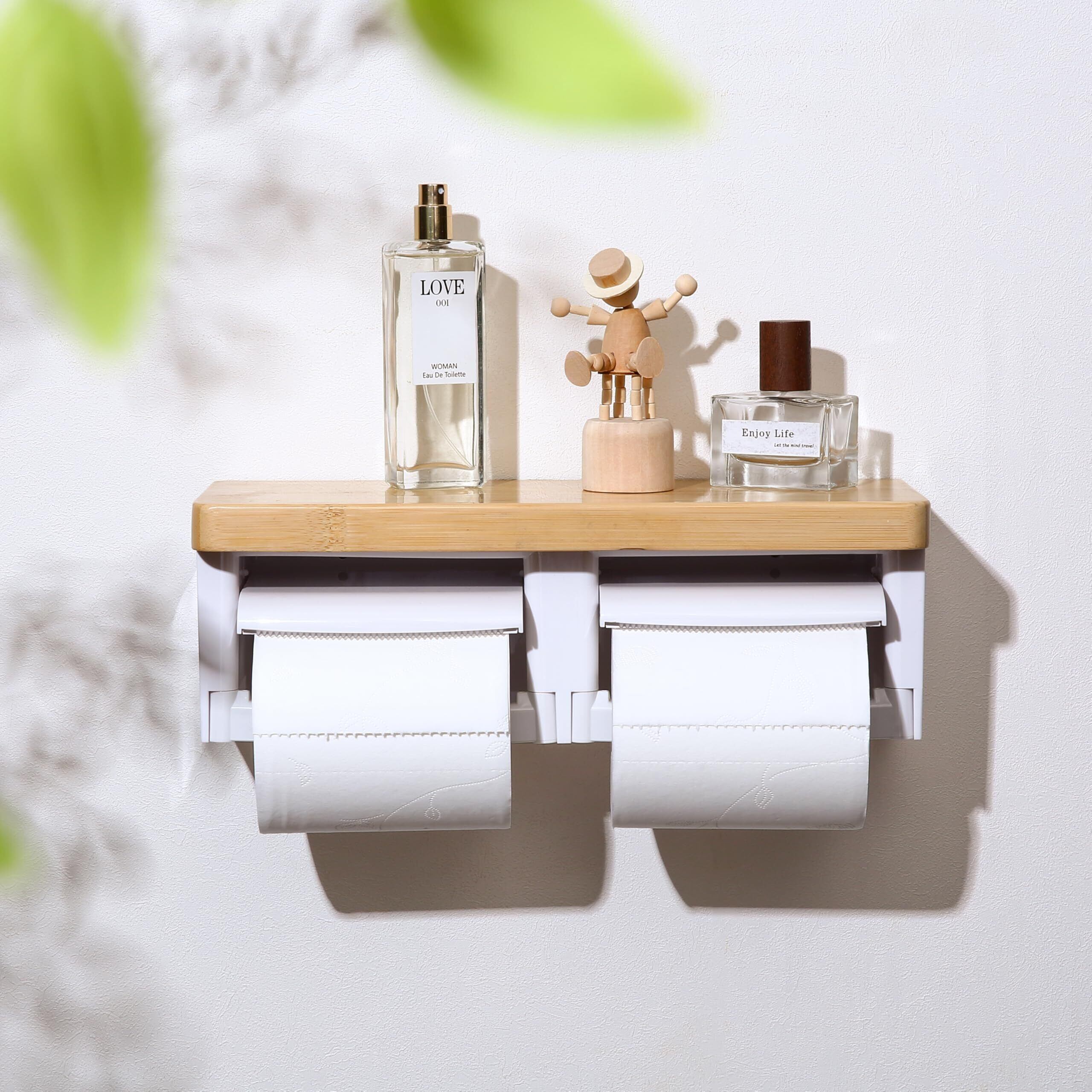 トイレットペーパーホルダー バスルーム ABSプラスチック楠竹木製製 切断機能付き DIY おしゃれ 2連 棚付き 賃貸対応 小物置き 簡単設置 補充楽 飾り棚 紙巻器 コンパクト設計(竹ホワイト, ダブル)