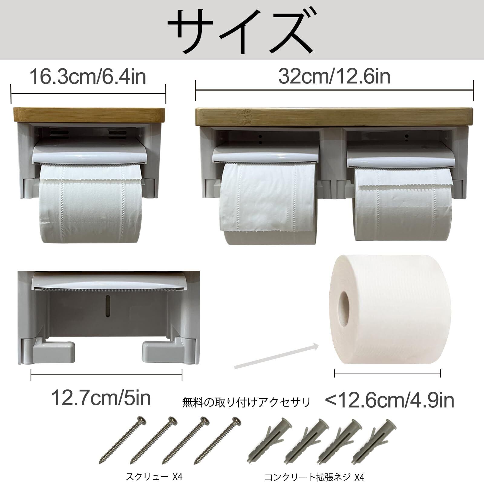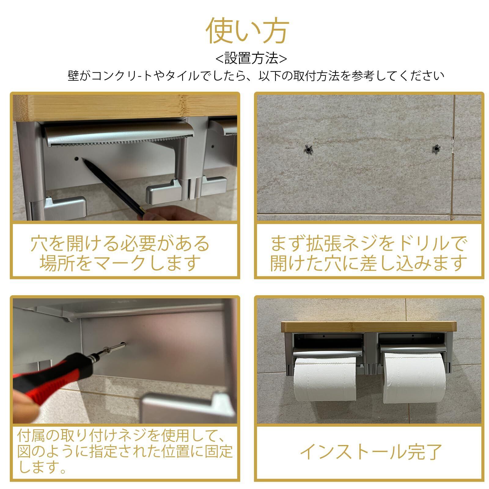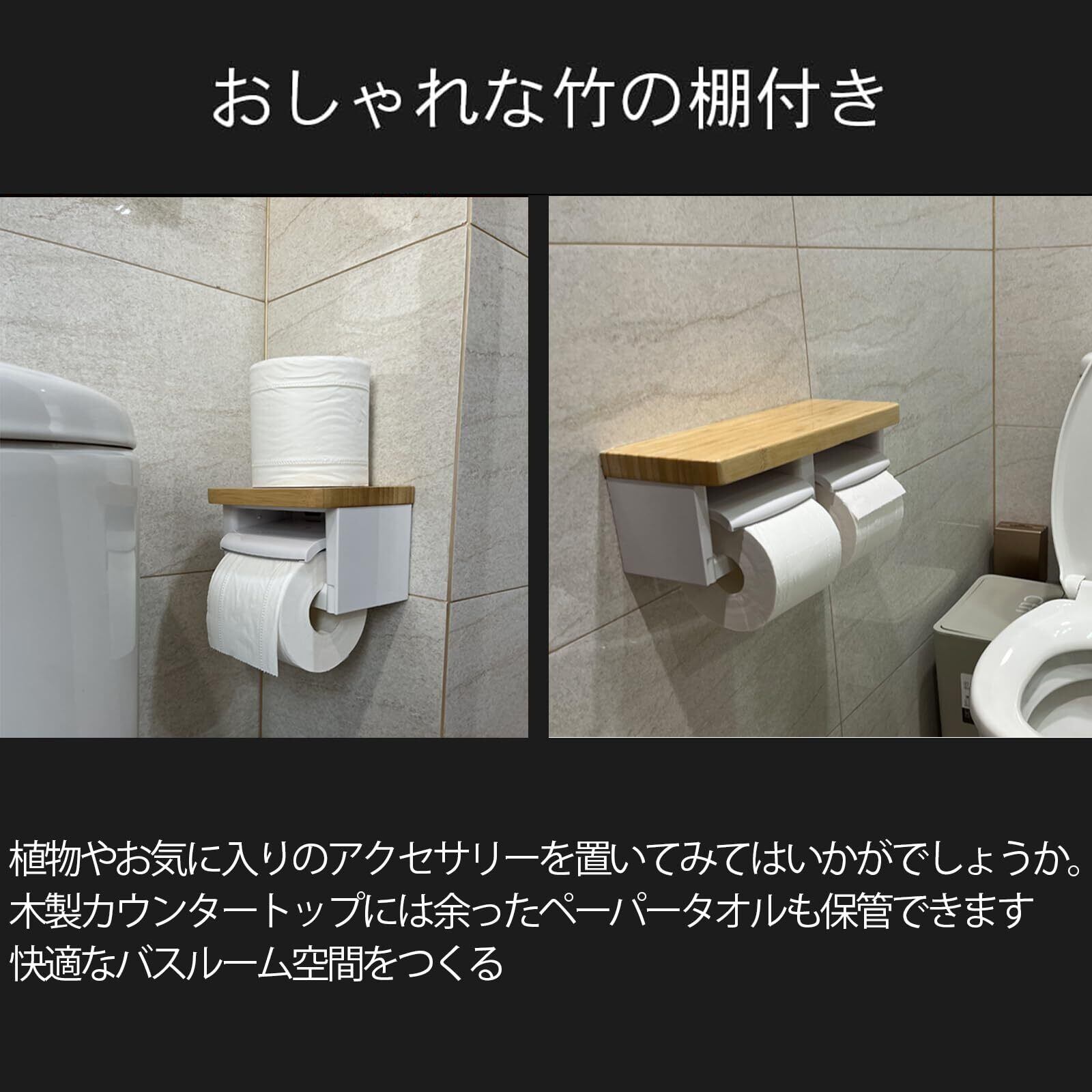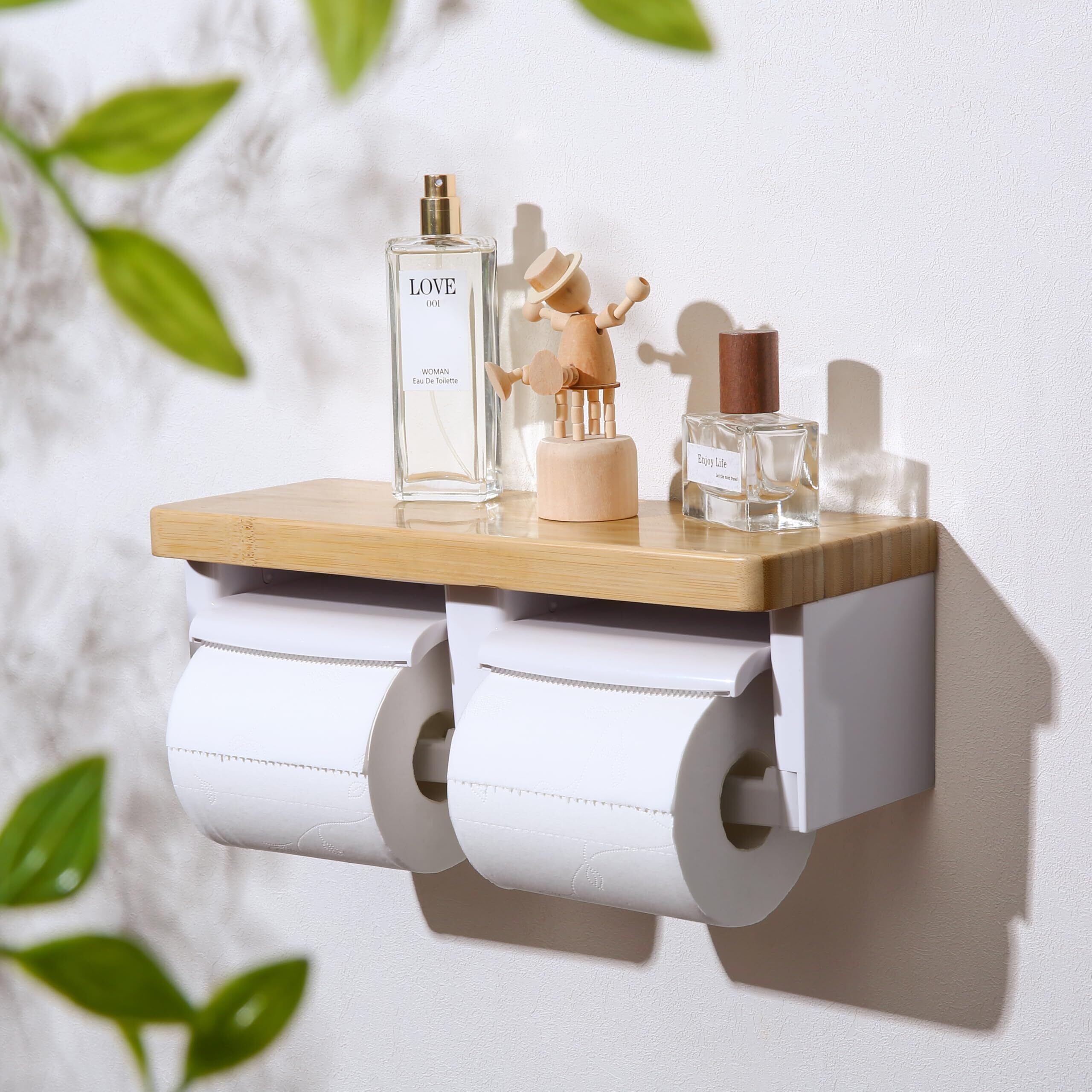 【2025最新】トイレットペーパーホルダー バスルーム ABSプラスチック楠竹木製製 切断機能付き DIY おしゃれ 2連 棚付き 賃貸対応 小物置き 簡単設置 補充楽 飾り棚 紙巻器 コンパクト設計(竹ホワイト, ダブル)