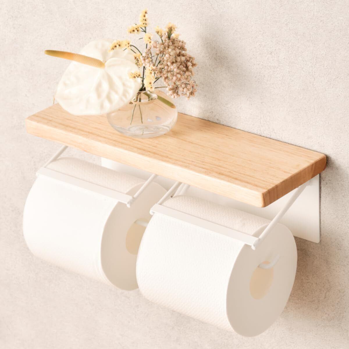 【新着商品】トイレットペーパーホルダー 2連 ダブル 無垢 木製 棚 おしゃれ 賃貸OK 2倍巻 3倍巻 (ラバーウッド × ホワイト)