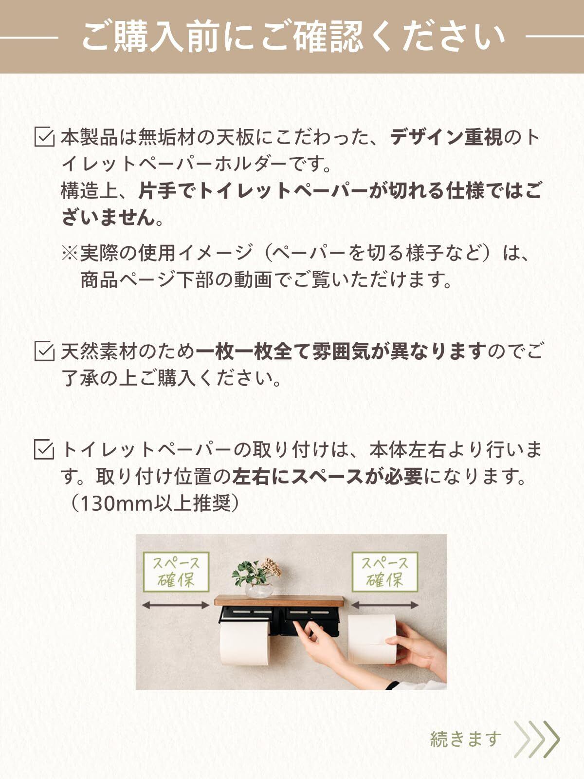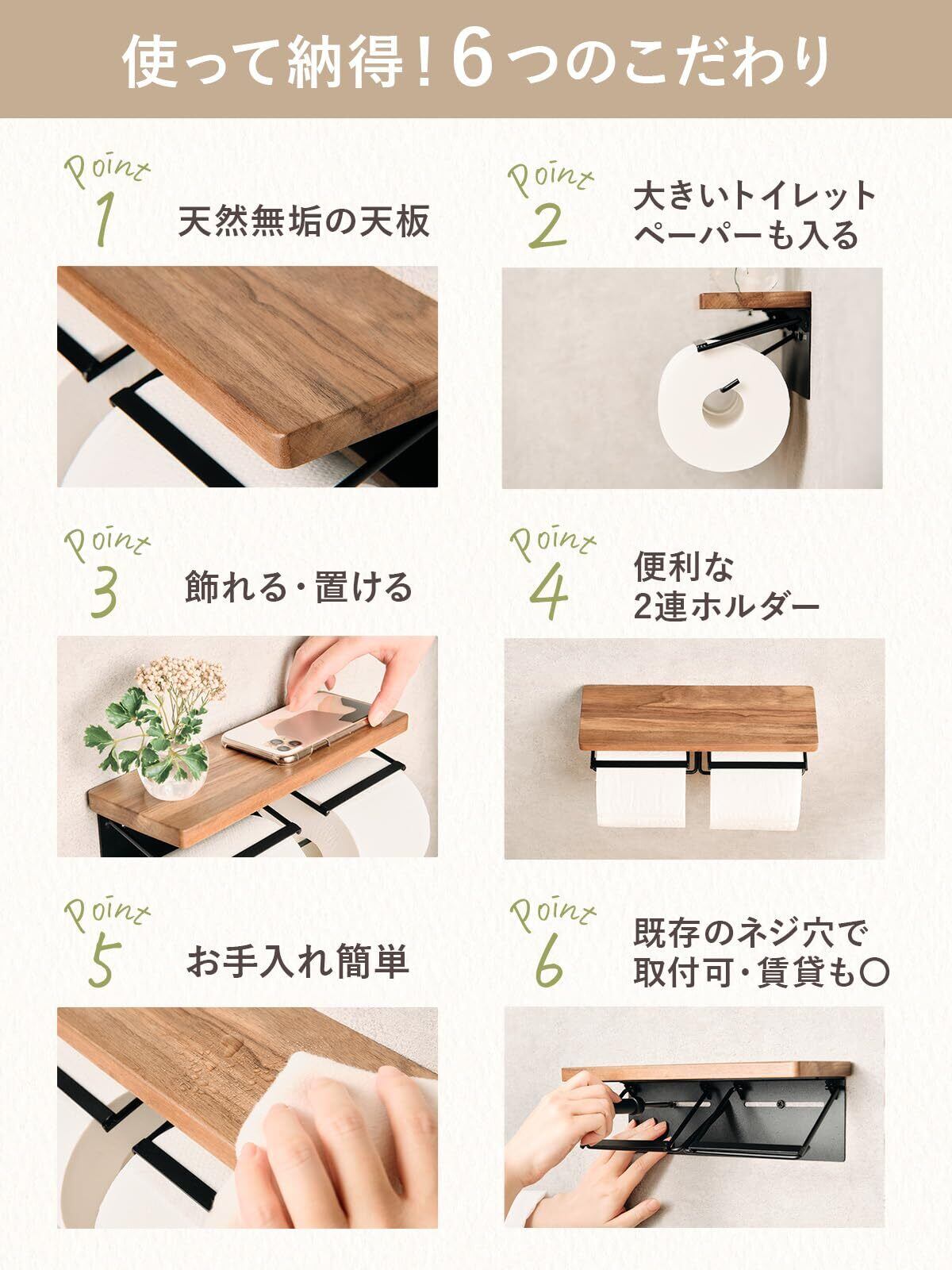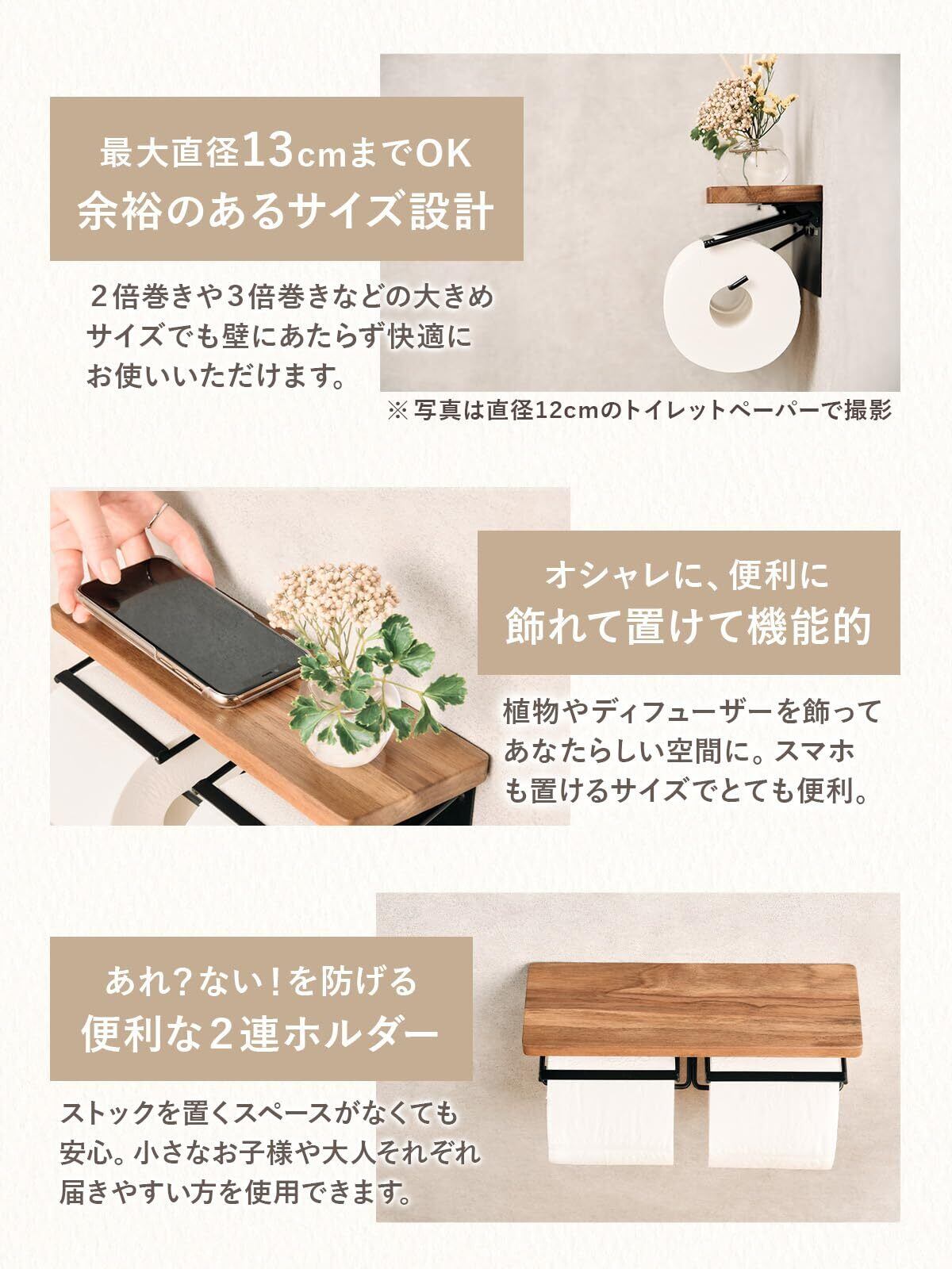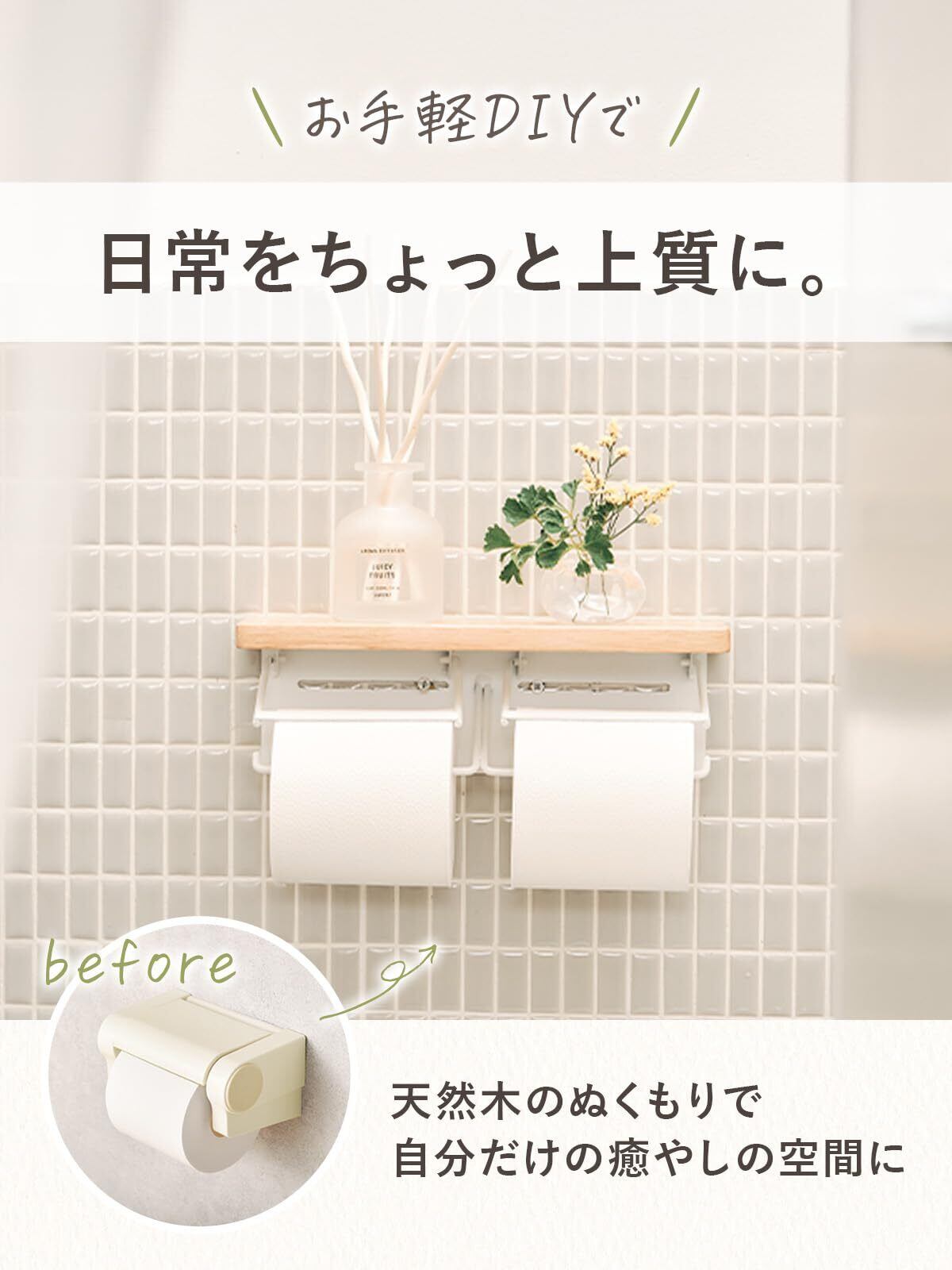 トイレットペーパーホルダー 2連 ダブル 無垢 木製 棚 おしゃれ 賃貸OK 2倍巻 3倍巻 (ラバーウッド × ホワイト)