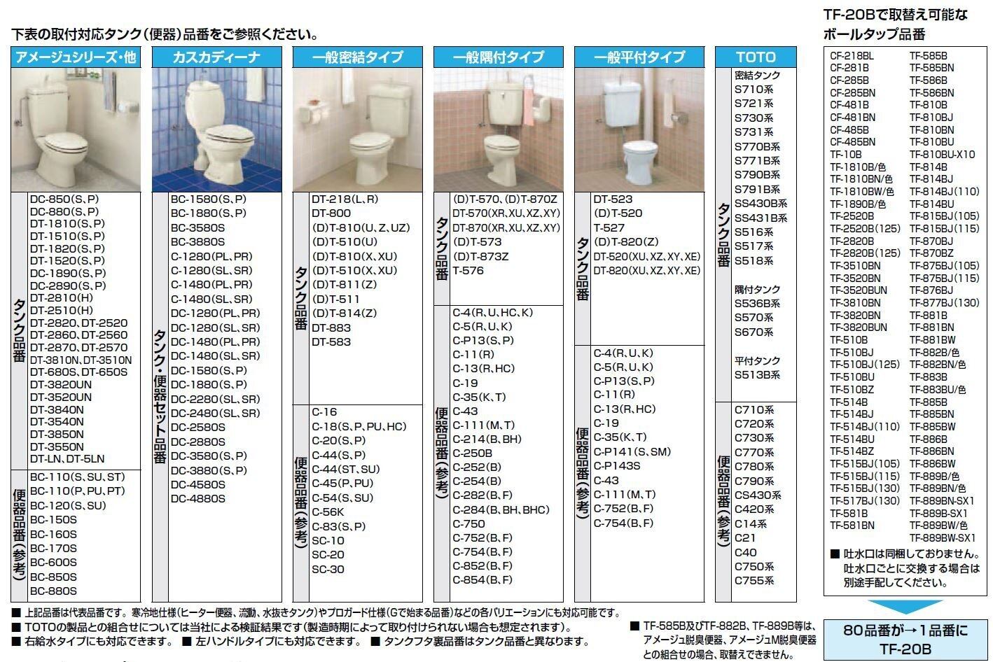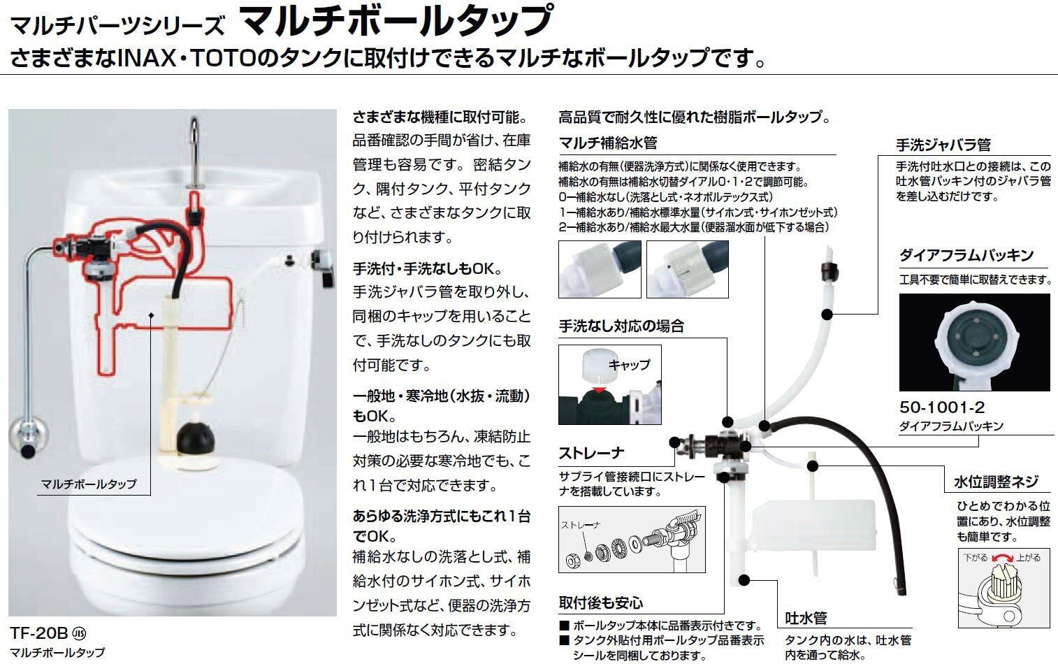 INAXマルチボールタップTF-20B・ほとんどの機種に取付可能品番確認の手間が省け、密結タンク、隅付タンク、平付タンクなど、ほとんどのタンクに取り付けられます。・手洗付、手洗無もOK手洗ジャバラ管を取り外し、同梱のキャップを用いることで、手洗なしのタンクにも取付可能です。・一般地、寒冷地もOK一般地はもちろん、凍結防止対策の必要な寒冷地でも、これ1台で対応できます。・あらゆる洗浄方式にもこれ1台でOK補給水なしの洗落し式、補修水付のサイホン式、サイホンゼット式など、便器の洗浄方式に関係なく対応できます。INAX マルチボールタップ TF-20B