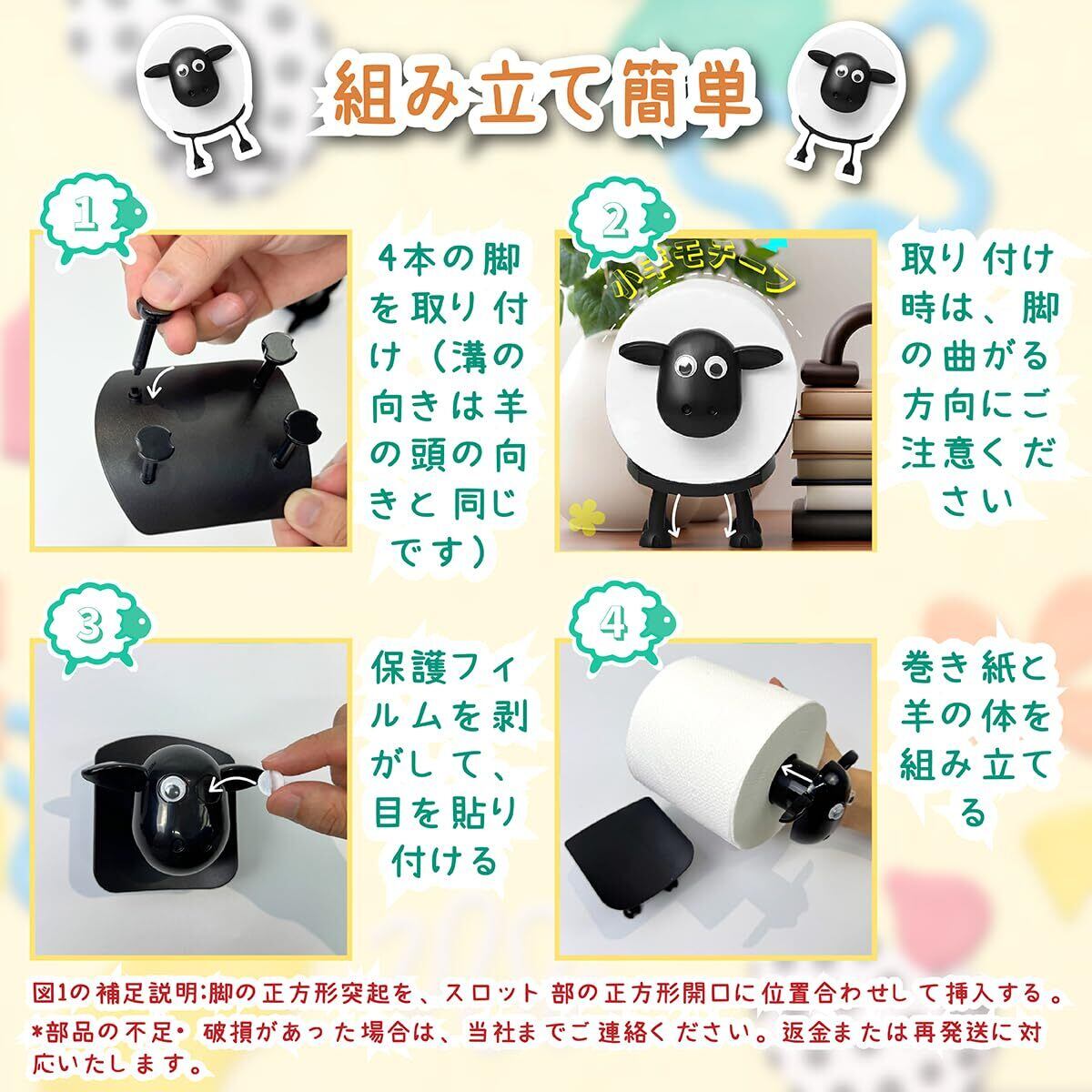 【組み立て方】1.羊の足4本を穴に差し込む。2.目の裏の保護フィルムを剥がして貼り付ける。3.羊の体にロールティッシュをセットしたら完成!