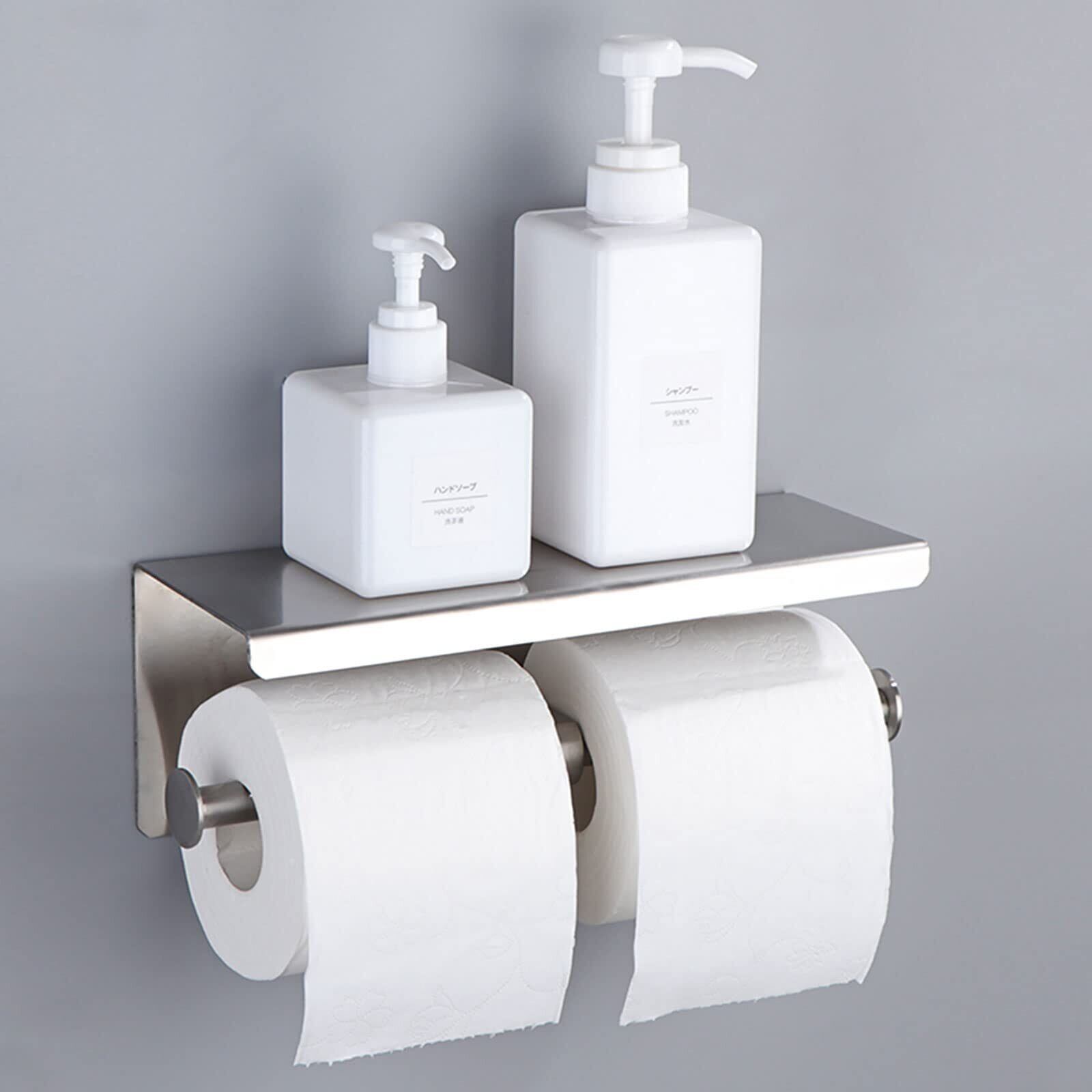 WXVOVXW トイレットペーパーホルダー 2連 トイレっとペーパーホルダー ペーパーホルダー トイレ 棚付き2枚紙巻き スマホや小物などが置ける棚板付き 太巻き 芯なし 対応 簡単設置 工事不要 マンション 戸建て 賃貸 インテリア DIY ステンレス製ダブルペーパーローラー 棚板付き 27cm幅 ネジ付き (シルバー 2連)