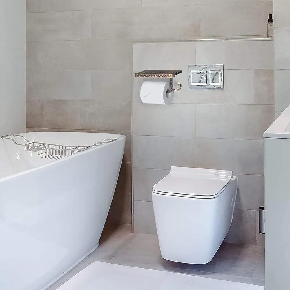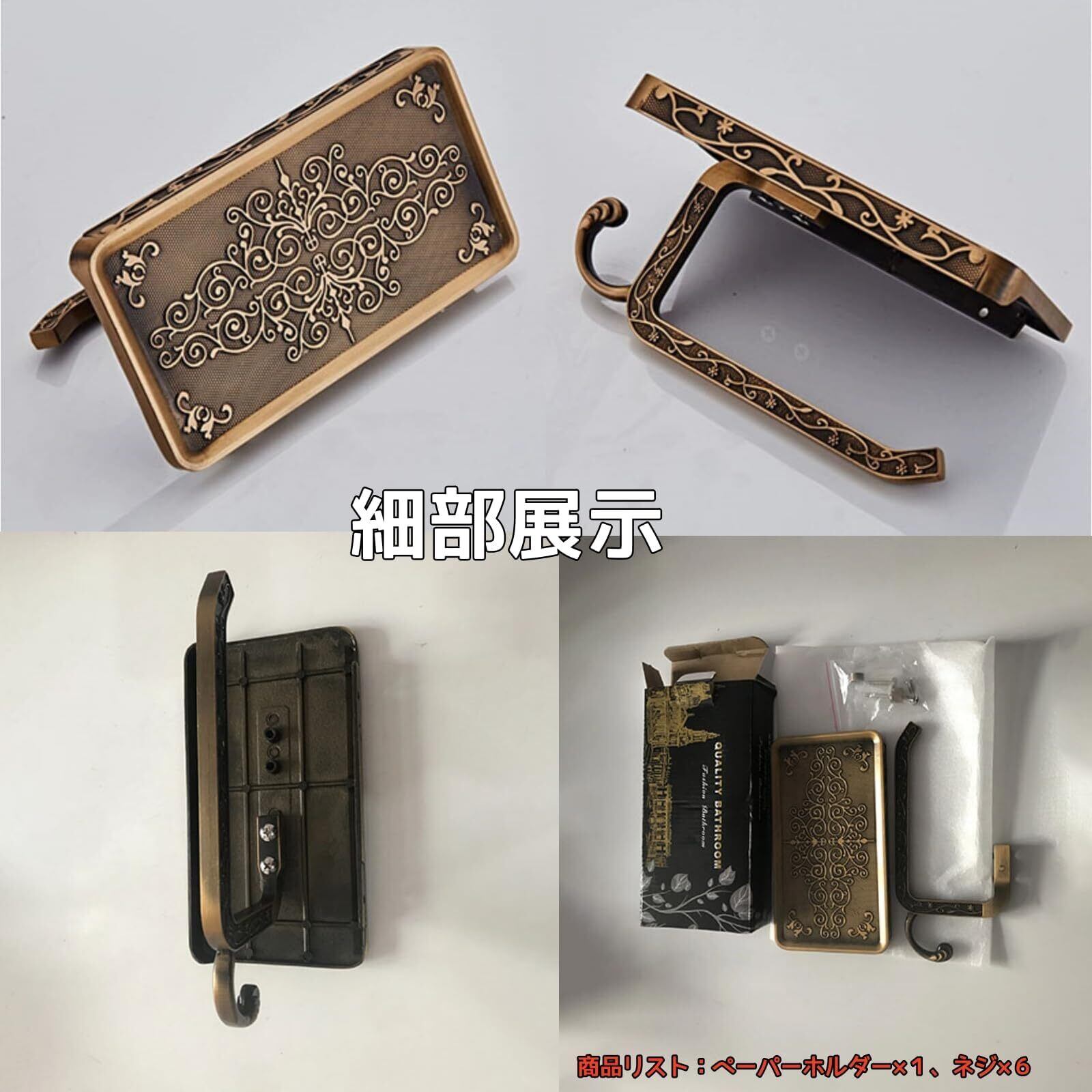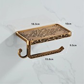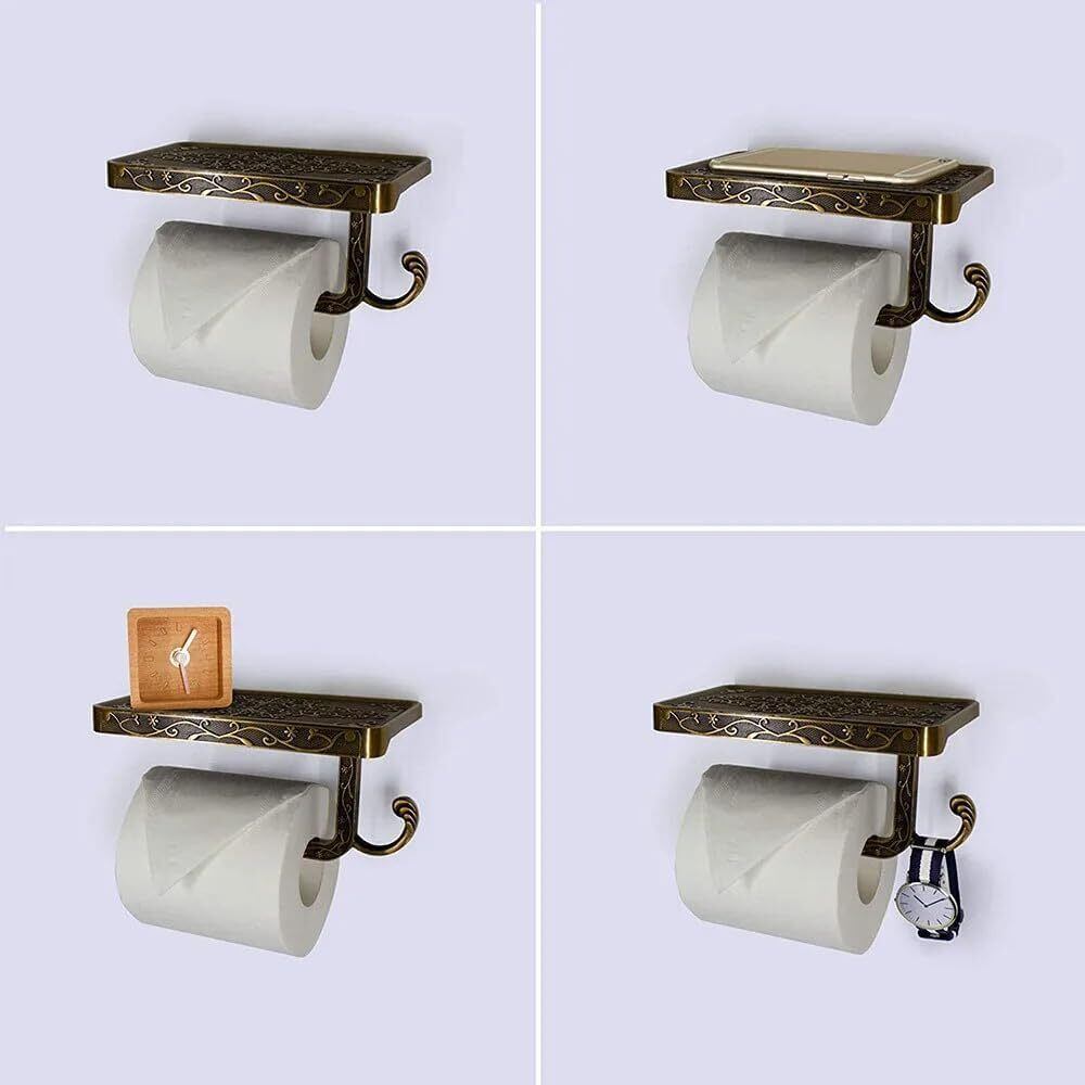 【限定セール】【KWQKEM】トイレットペーパーホルダーフック付き 真鍮 アンティーク調 ペーパーホルダー 壁取り付け 欧風 おしゃれ 小物置き スマホ置き 棚付き 簡単取り付け ペーパーラック