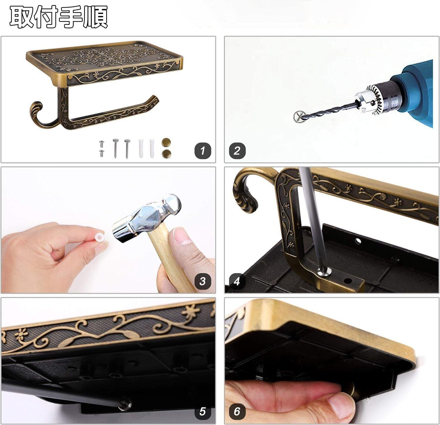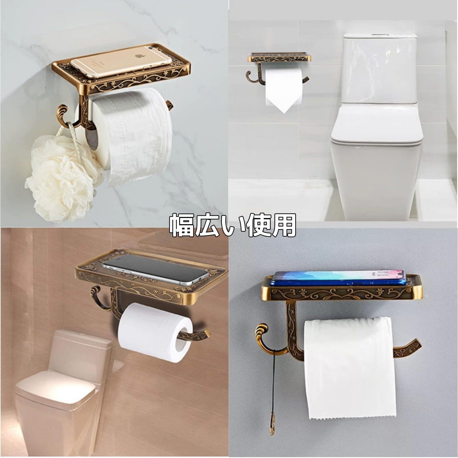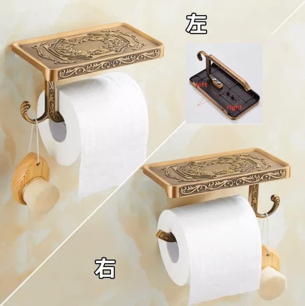 【限定セール】【KWQKEM】トイレットペーパーホルダーフック付き 真鍮 アンティーク調 ペーパーホルダー 壁取り付け 欧風 おしゃれ 小物置き スマホ置き 棚付き 簡単取り付け ペーパーラック