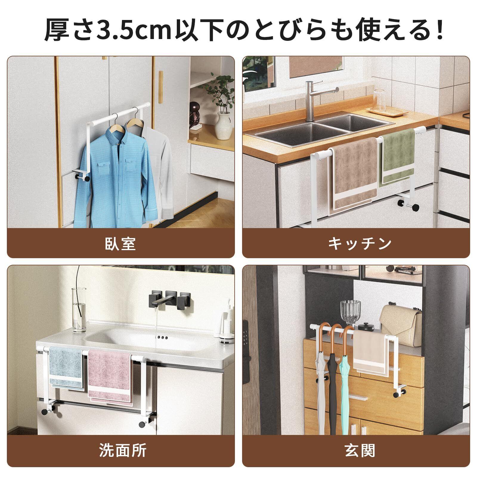 タオル掛け 伸縮式タオルバー フック式 タオルハンガー 穴あけ不要 キッチン浴室用 多機能タオルホルダー 賃貸対応 ホワイト