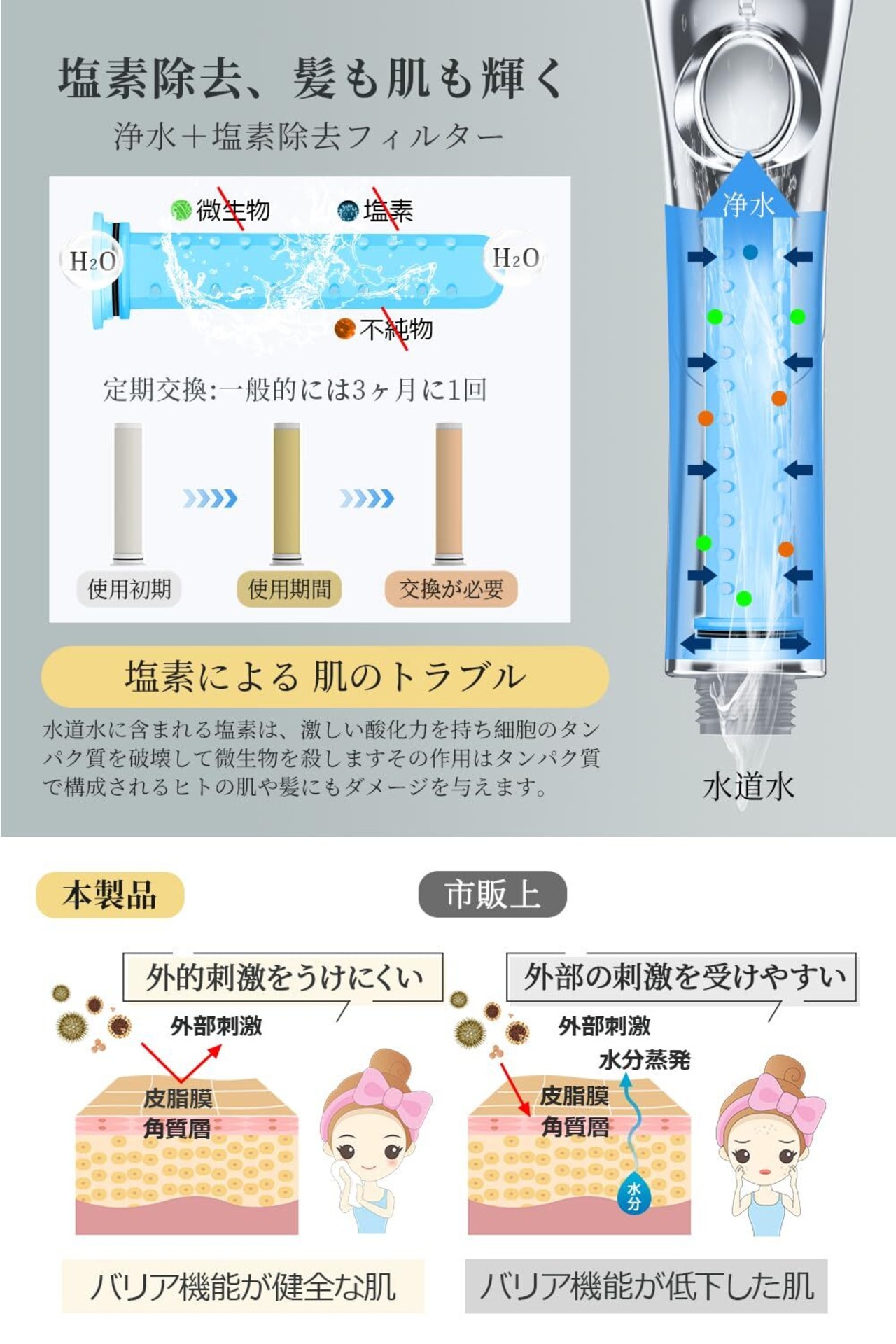 【塩素除去フィルター内蔵で、肌と髪にやさしい美水シャワー】 残留塩素や重金属を効果的に除去するフィルターを内蔵し、敏感肌や髪への負担を軽減。日本の水道水をやさしい“美水”に変え、肌の潤いを守りながら、髪のツヤや指通りを改善します。さらに保温効果が高まり、湯冷めしにくいのもポイント。入浴後もしっとり感が続き、まるでスパの後のようなリラックスを自宅で味わえます。