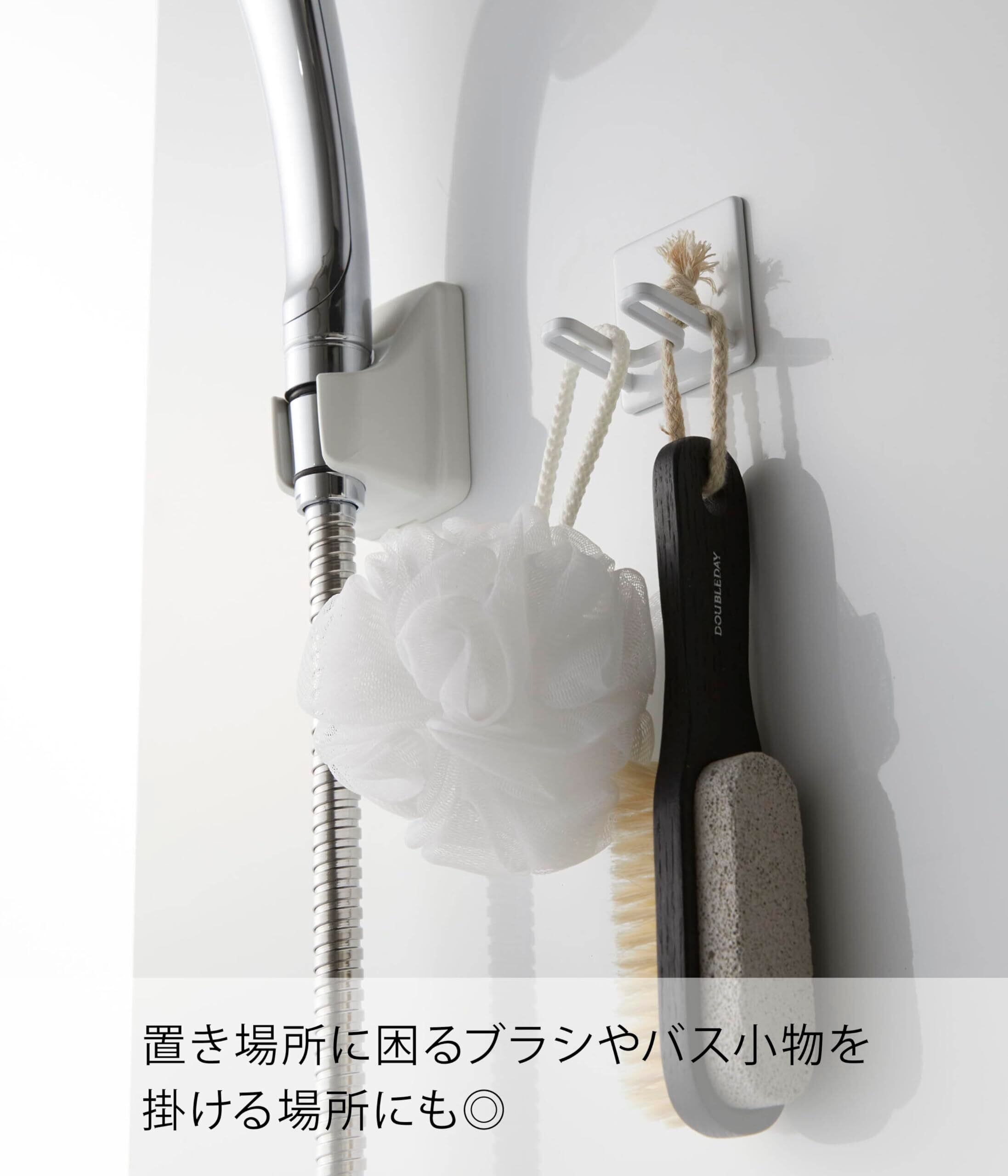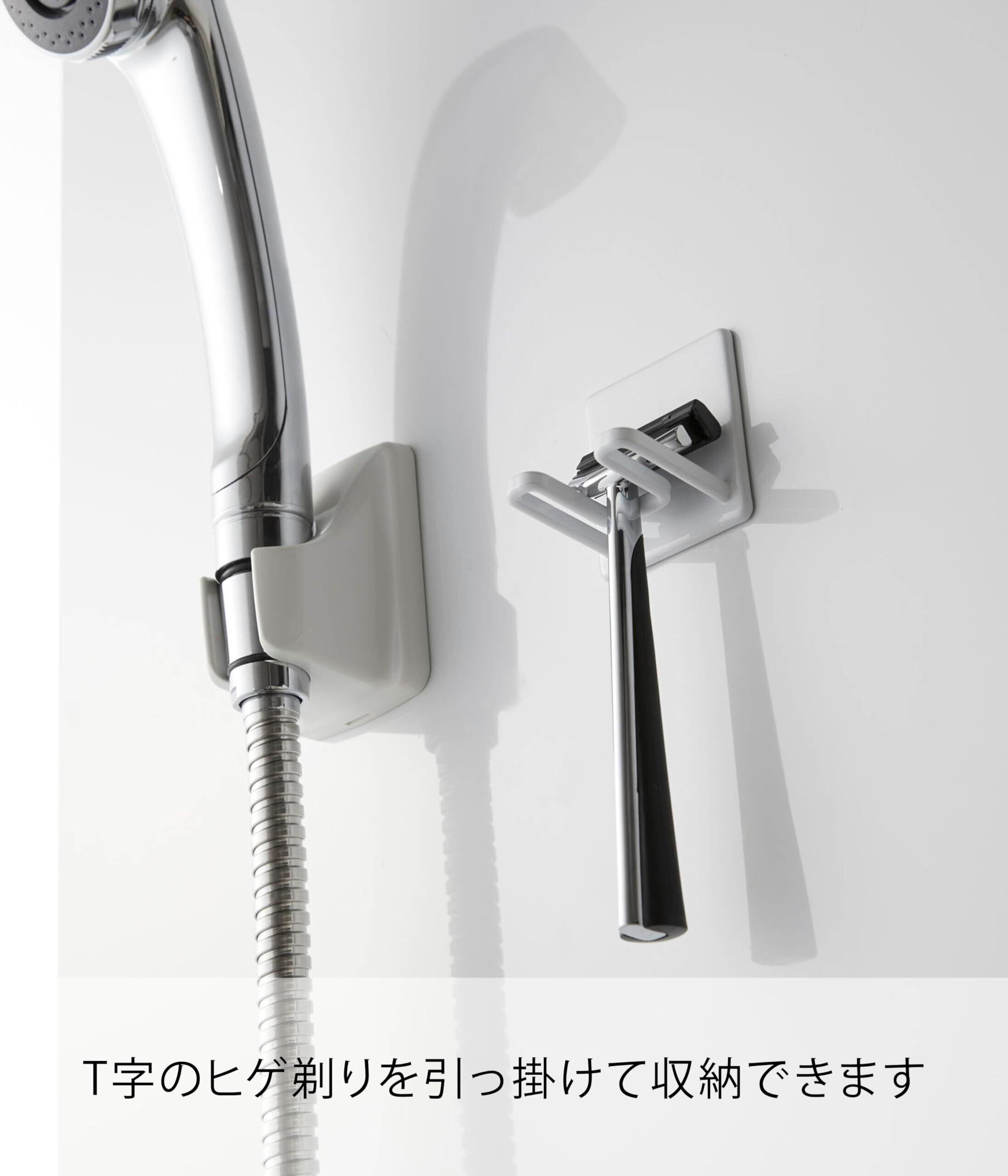 T字のヒゲ剃りを引っかけるだけ。置き場所に困るブラシやバス小物の収納に。