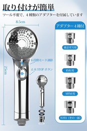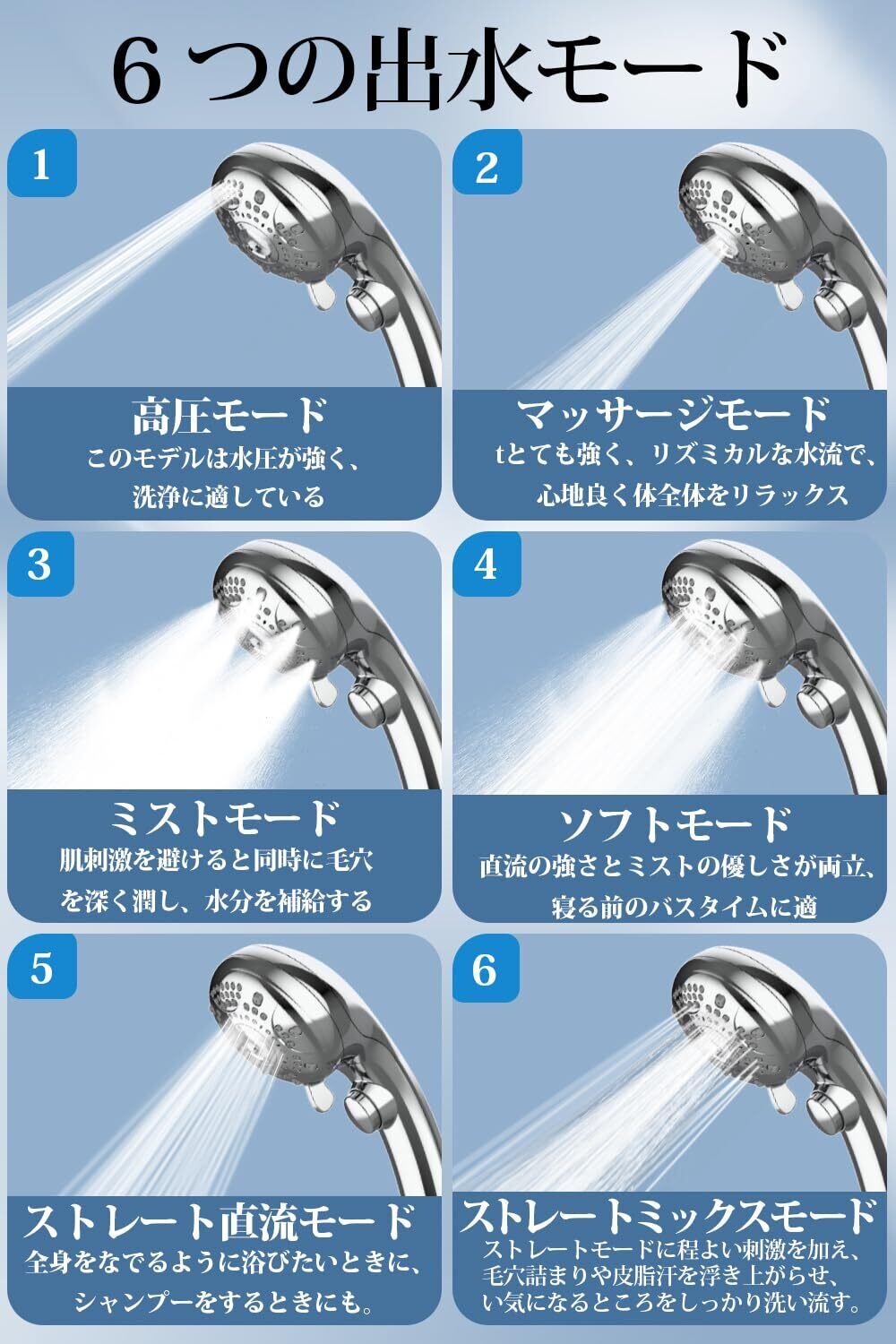 【6 モード切替 ×マイクロナノバブル × ストレス解消】 当社シャワーヘッドは 6 種類の水流モードを搭載し、全身のケアから浴室の清掃まで幅広く対応! ① 高圧モード:集中的な強力水流でトイレやタイルの汚れも一掃。 ② マッサージモード:リズミカルな水流で肩こりや疲れを癒す水力マッサージ効果。 ③ ミストモード:ウルトラファインバブルで肌を優しく包み、敏感肌や顔洗いに理想的。 ④ ソフトモード:ミストとストレートの融合で泡立ちを最大化し、毛穴の皮脂を浮かせる。。 ⑤ ストレート直流モード:広範囲での効率的洗浄に最適。髪や体の汚れを一気に流す ⑥ ストレートミックスモード:強めの刺激で深層洗浄とリラックスを両立。 マイクロナノバブル技術により、1μm 未満の超微細気泡が肌に浸透し、通常の水では落とせない汚れや油脂を徹底的に除去。モード切替はボタン操作で簡単に可能です、日々のシャワーを SPA 級の贅沢体験にアップグレード!