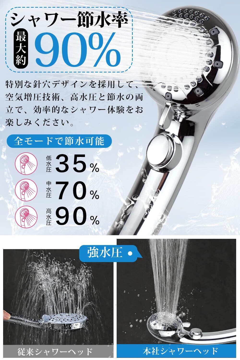 【手元ワンタッチ止水 ×90% 節水 × シャワーヘッド 高水圧!】 革新的な「マイクロナノバブルテクニカル」と空気力学を融合し、従来比 90% の節水性能を実現!手元に設置した止水ボタンで、シャンプー中や泡立て中も片手で簡単に水流をオン / オフ。低水圧環境でも高速ドライヤーの風孔デザインを応用した増圧技術により、安定した強力な水流を提供し、汗や汚れを短時間ですすぎきれます。精密散水板で使用感を損なわずに最大 90% の節水を実現し、水道代だけでなくガス代・電気代も節約!節水と快適さの両立、環境にも優しい「2025 年新世代シャワーヘッド 節水」をお試しください!