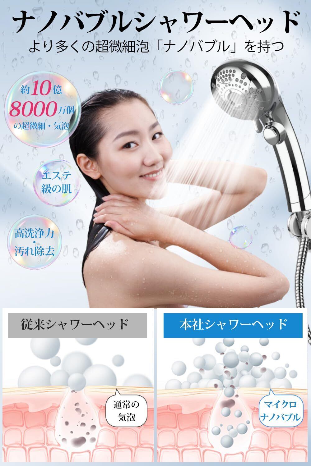 【超微細マイクロナノバブル シャワーヘッド】 当社シャワーヘッドは、業界最高クラスの「超微細マイクロナノバブル技術」を採用し、1μm 未満の超微細気泡を約10億8000万個生成!毛穴よりも小さな気泡が肌の奥深くまで浸透し、水道水では落とせない皮脂、汗、メイク残留を徹底的に洗い流します。さらに、超微細バブルにより水中の酸素量を増加させ、肌を優しく包み込みながら保湿成分を閉じ込め、乾燥や粗さを改善し、滑らかでつやのある肌へと導きます。