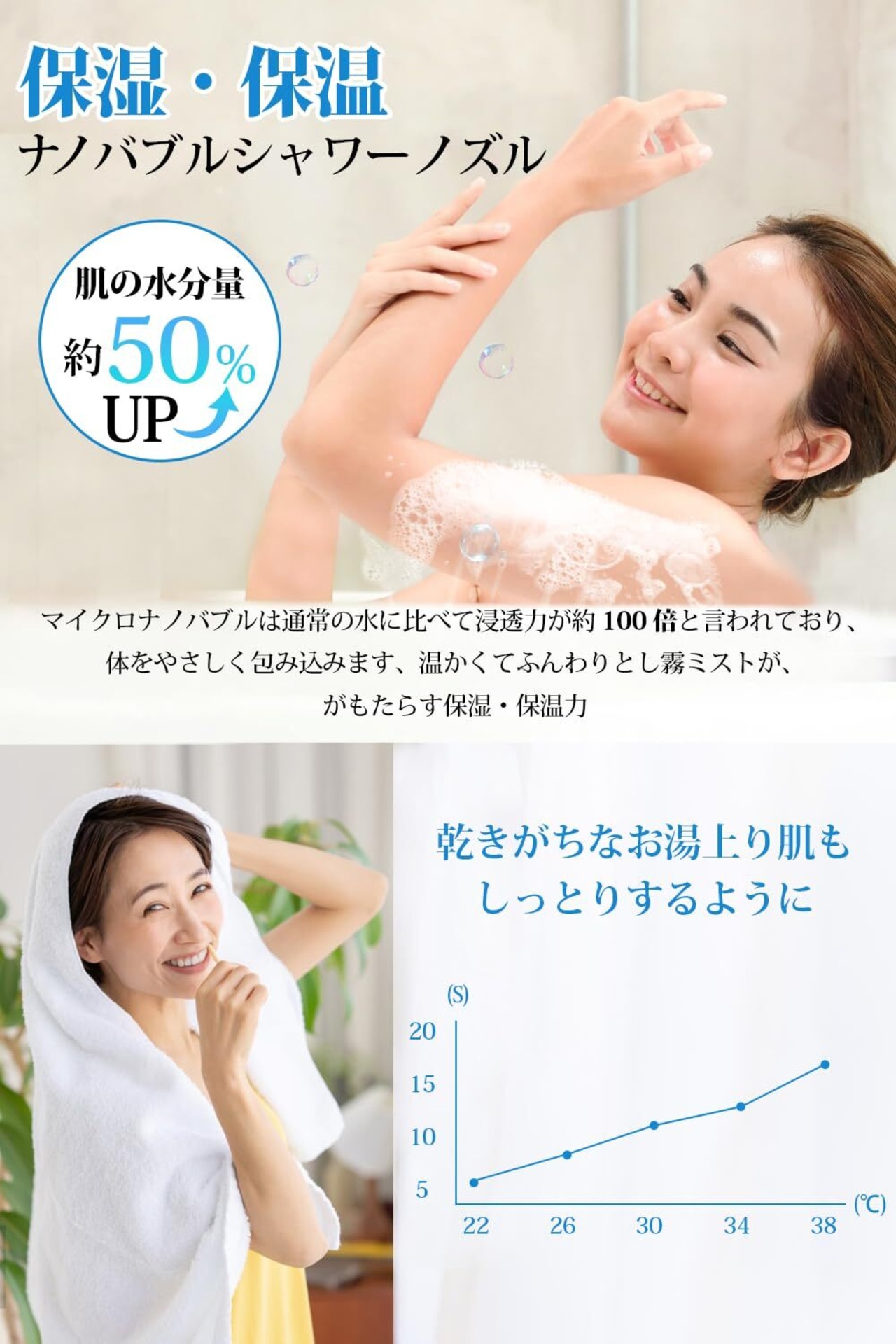 【保温 ×保湿】マイクロナノバブルは水温を安定させる特性があり、長時間の入浴でも体温を維持し、ゆったりとしたリラックスタイムをお楽しみいただけます。敏感肌や乾燥肌にも低刺激で使用可能で、日々のシャワーが「ホテルスパ級の肌ケア」に昇華します。ミストシャワーヘッド、これまでにない「目に見えない超微細泡」による洗浄力と保湿効果を体験してください!